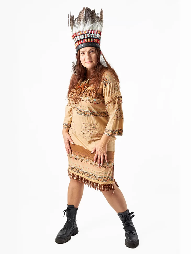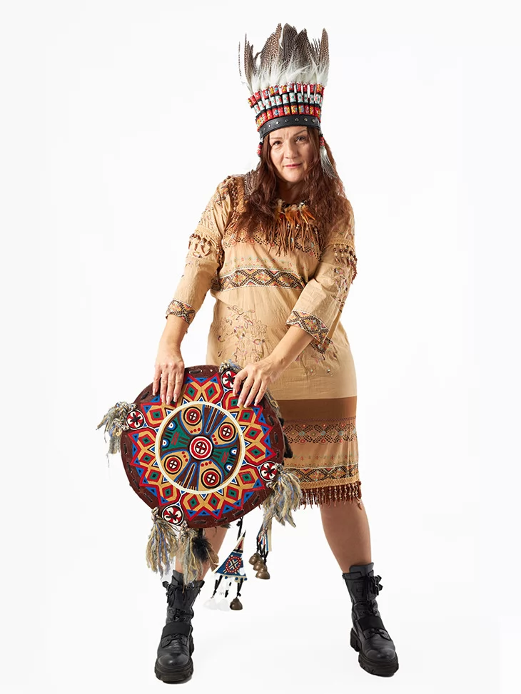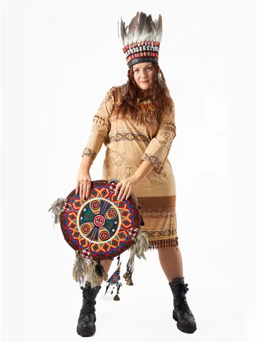 Традиційна сукня з етнічним орнаментом, багатошарове намисто та виразний головний убір з пір’ям створюють атмосферу ритуалів, єднання з природою та внутрішньої сили. Образ виглядає впевнено, глибоко і дуже характерно — ідеальний вибір для тематичних подій, де важлива не просто яскравість, а сенс. Такий варіант чудово підходить для прокату карнавальних костюмів, коли хочеться передати дух традицій і автентики.