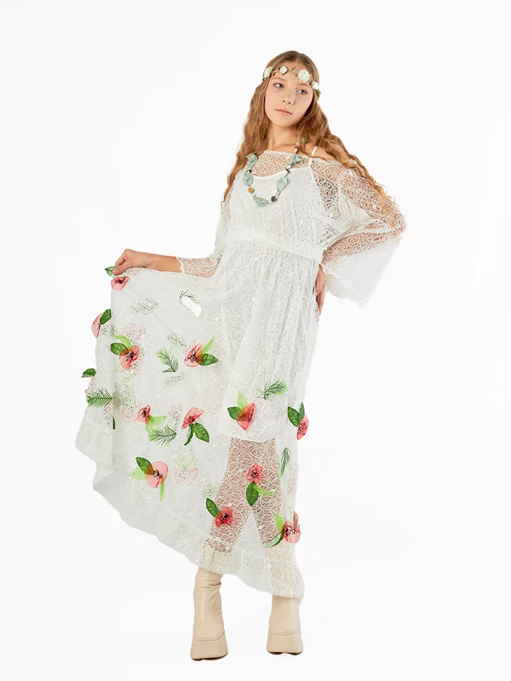 – довга біла сукня з прозорого мережива з квітково-листяним декором