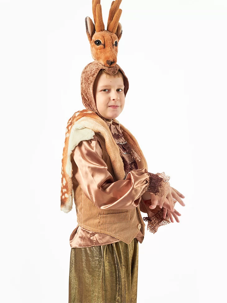 Цей витончений та теплий образ переносить у чарівний світ лісових історій і зимових казок. М’які природні відтінки, декоративне жабо та шапка з мордочкою оленя створюють впізнаваного і дуже милого персонажа. Чудовий вибір для оренди карнавальних костюмів на дитячі ранки, святкові вистави та тематичні події.