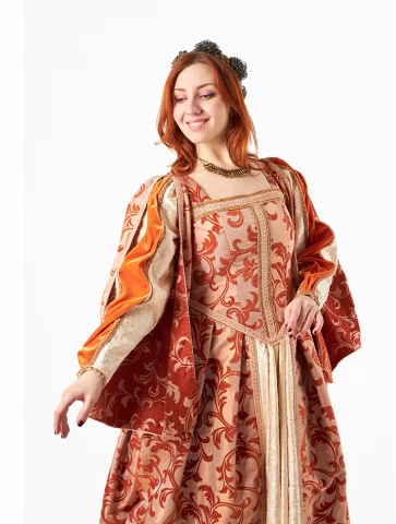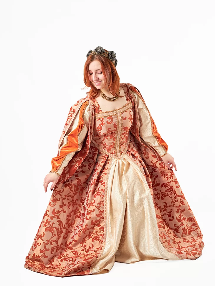 Цей розкішний образ у стилі ренесанс виглядає шляхетно, тепло та неймовірно святково. Поєднання теракотового візерунку з ніжним золотим відтінком створює ефект королівської розкоші, а пишні рукави та багатошарова сукня роблять силует особливо сценічним. Корона та намисто додають образу статусу й завершеності, перетворюючи кожен вихід у справжню палацову появу. Чудовий варіант для оренди карнавальних костюмів на бали, фотосесії, вистави та тематичні події.