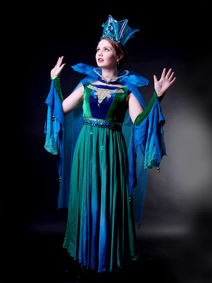 Цей величний образ поєднує холодну шляхетність льоду та глибоку магію океану. Насичені відтінки синього й смарагдового, корона з фантазійними лініями та легкі напівпрозорі накидки створюють ефект королеви стихій, яка керує хвилями й морозами. Образ виглядає урочисто та фотогенічно, ідеально підходить для оренда карнавальних костюмів на тематичні свята, театральні постановки, фотосесії та зимові івенти.