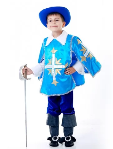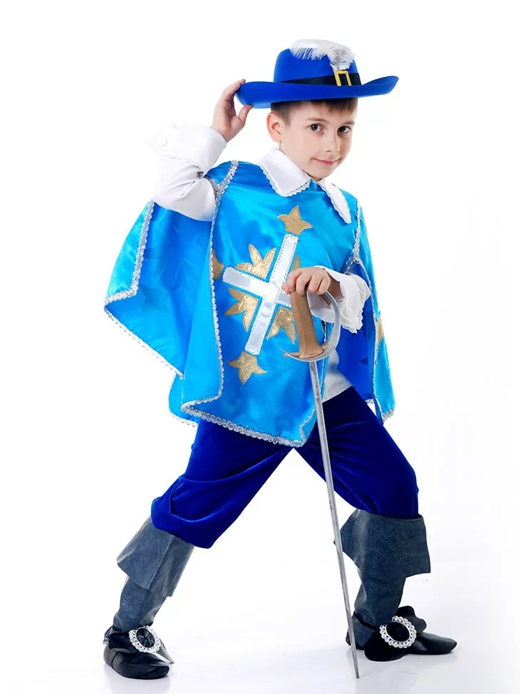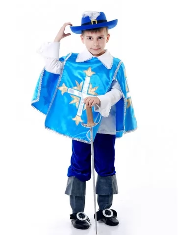 Цей динамічний і шляхетний образ натхненний легендами про відважних мушкетерів, де честь, дружба й відданість були понад усе. Насичений синій колір, контрастний хрест і капелюх із пером створюють виразний силует, який одразу впізнається. Чудовий вибір для оренди карнавальних костюмів на шкільні свята, театралізовані виступи та фотосесії.