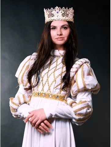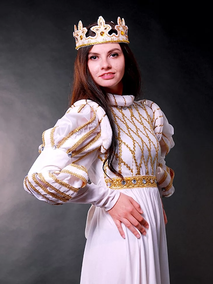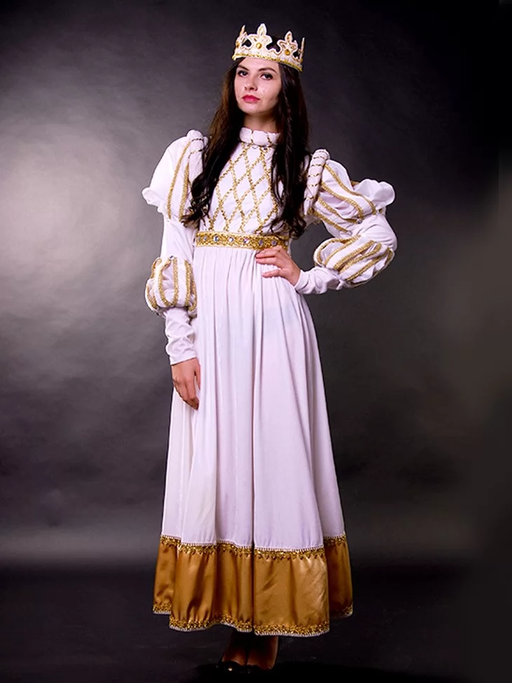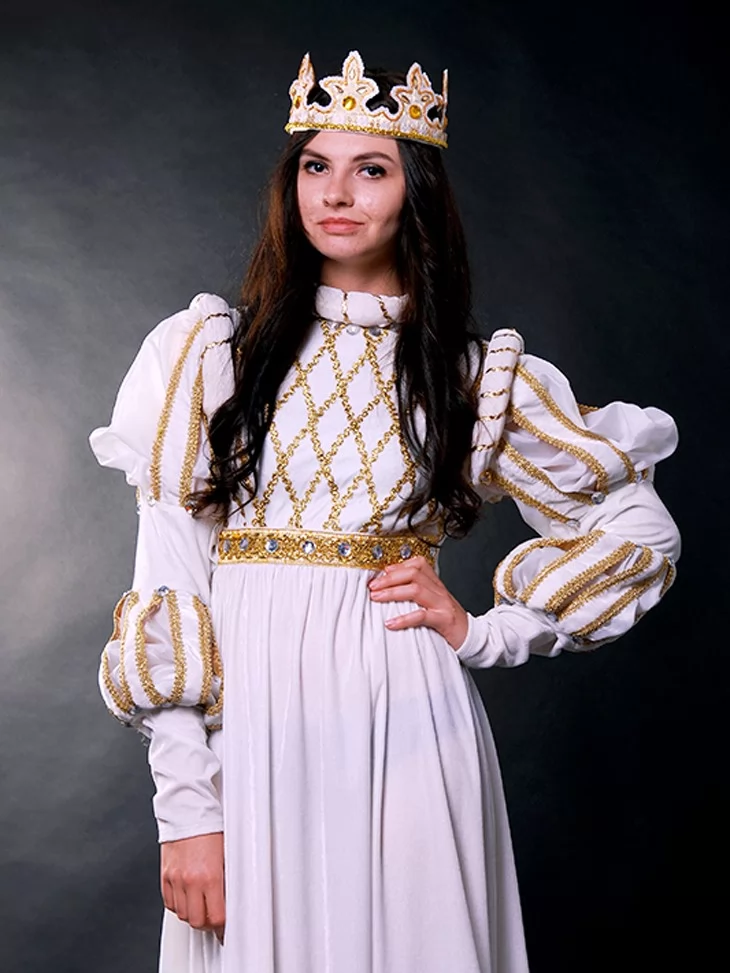 Цей розкішний образ у стилі середньовіччя виглядає ніжно, урочисто та по-справжньому королівськи. Біла сукня з золотим оздобленням створює ефект чистоти й величі, а пишні рукави додають силуету сценічності та благородства. Корона завершує перевтілення та робить образ впізнаваним з першого погляду. Ідеальний варіант для оренди карнавальних костюмів на фотосесії, виступи, тематичні вечірки та урочисті події.