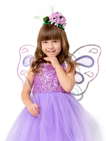 Ніжний казковий образ, наповнений сяйвом, легкістю та чарівною атмосферою весняного дива. Цей витончений фейський костюм поєднує блискучий ліф у лавандових відтінках із повітряною фатіновою спідницею та прозорими крилами, створюючи образ справжньої маленької чарівниці. Він виглядає святково, легко й дуже фотогенічно — ідеальний варіант для оренди карнавальних костюмів на ранки, вистави та тематичні події.