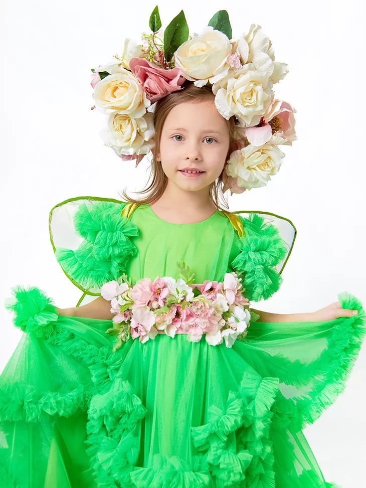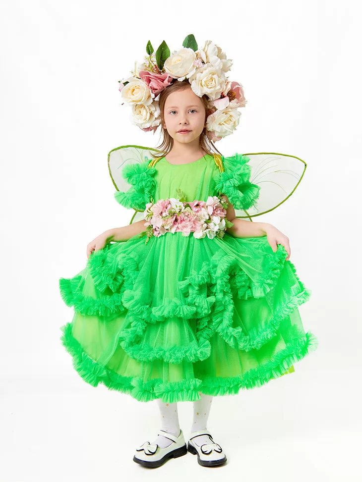 Розкішний образ феї, народженої серед квітів, зелені та ніжного сонячного світла. Яскраво-зелена багатоярусна сукня з пишними фатіновими рюшами виглядає по-справжньому святково та об’ємно. Декоративний квітковий пояс і розкішний вінок із великих троянд створюють ефект живого весняного букету, а прозорі крильця додають образу казкової легкості. Це ідеальний варіант для оренди карнавальних костюмів на ранки, фотосесії та тематичні вистави.