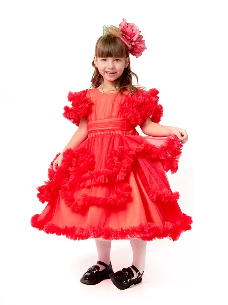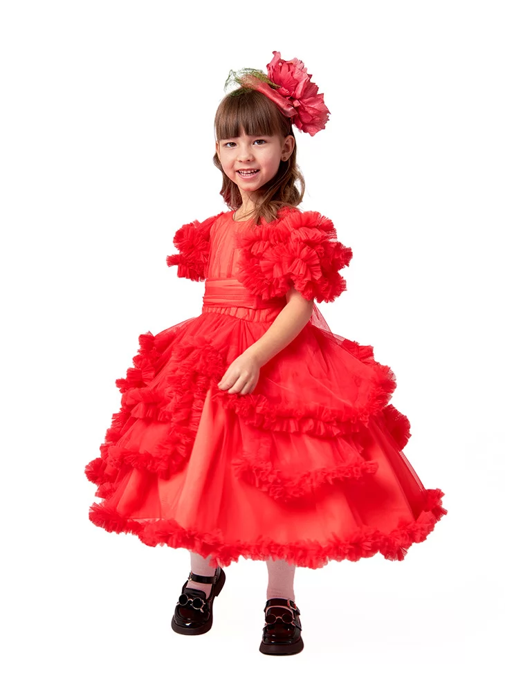 Яскравий квітковий образ, що передає красу розквітлої півонії, святкову пишність та ніжну казкову елегантність. Насичено-червона сукня з багатоярусної фатінової тканини створює ефект об’ємних пелюсток, які красиво хвилюються у русі. Декоративні рюші додають образу повноти й сценічної виразності, а велика квітка у волоссі завершує квіткову композицію. Це чудовий вибір для оренди карнавальних костюмів на весняні свята, виступи та яскраві фотосесії.