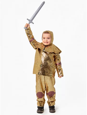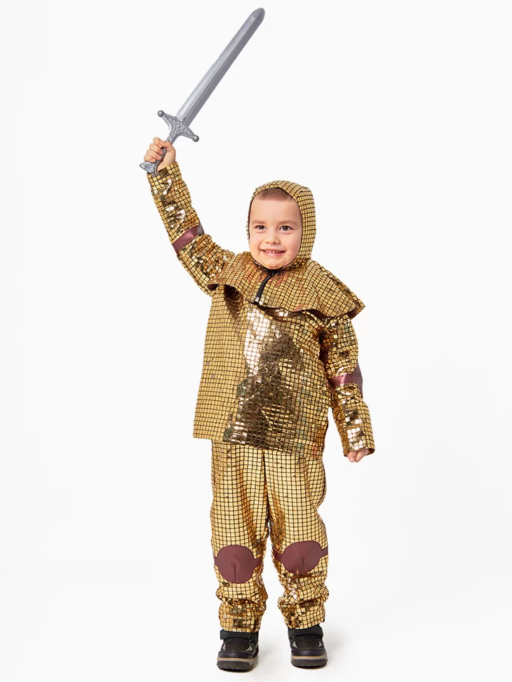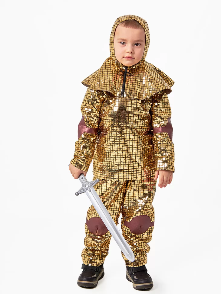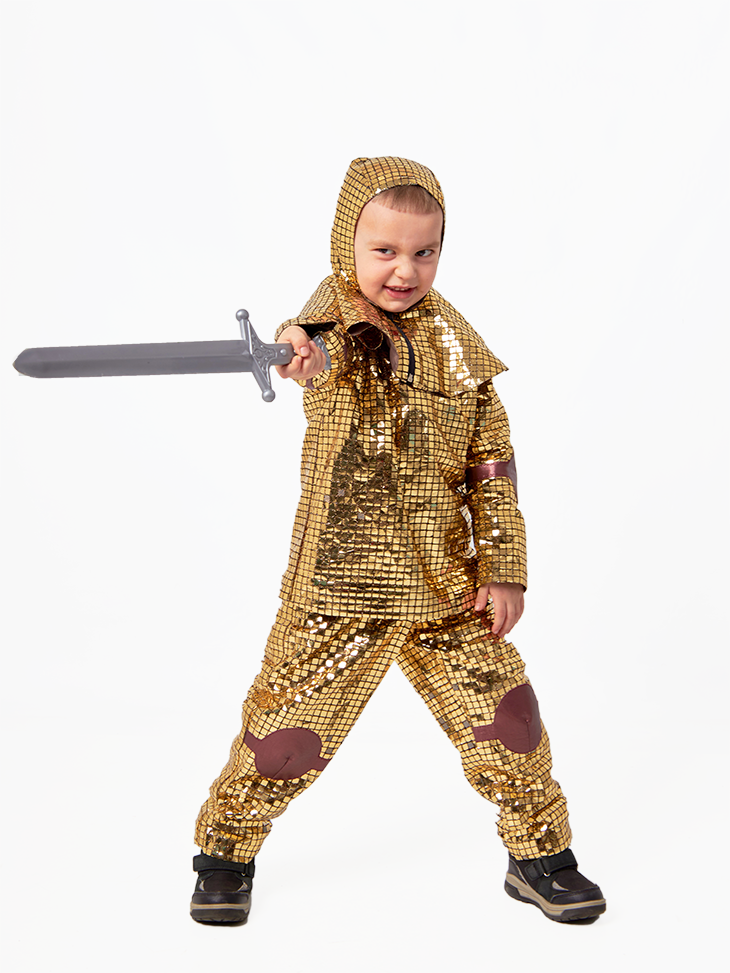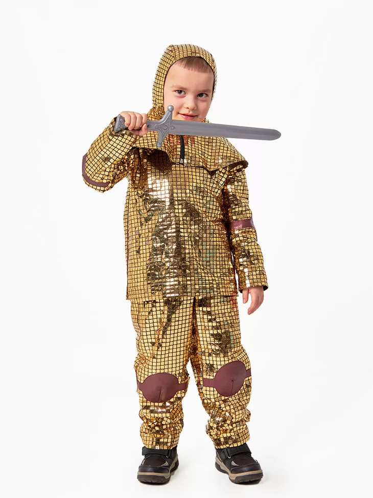 Цей карнавальний костюм Золотого Лицаря створений для справжніх маленьких воїнів, які мріють про подвиги, перемоги та світлу славу. Завдяки блискучому матеріалу та яскравому вигляду, дитина точно стане зіркою будь-якого свята або вистави. Прокат карнавальних костюмів — можливість зануритись у світ уяви.