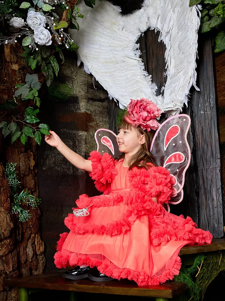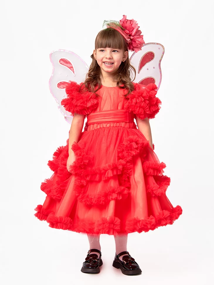 Яскравий казковий образ, що ніби народився з пелюсток чарівної квітки та наповнений теплом, світлом і радістю. Повітряна червона сукня з багатошаровими рюшами створює пишний силует, а ніжні крила додають феєричності та легкості кожному руху. Це чудовий вибір для оренда карнавальних костюмів на свята, виступи та фотосесії з казковою атмосферою.