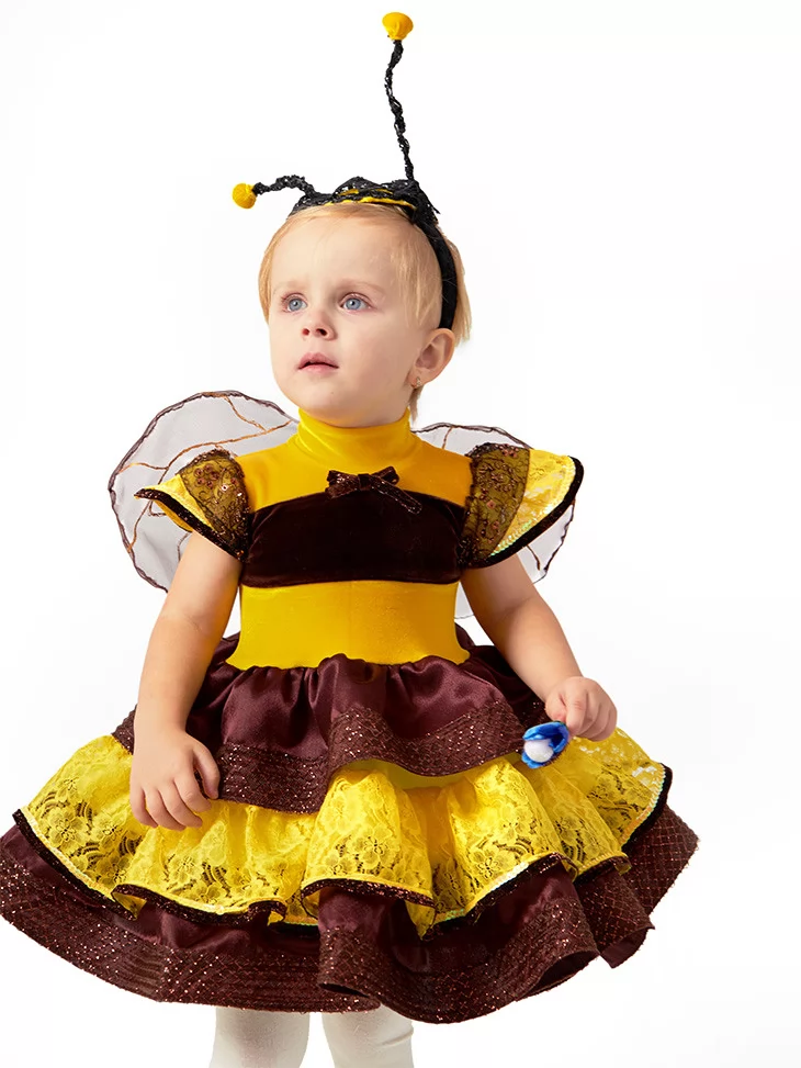 Ніжний і веселий образ чарівної бджілки створений спеціально для найменших принцес, щоб кожне свято було теплим, яскравим і казковим. Жовто-коричнева сукня з пишною багатошаровою спідничкою виглядає святково та дуже мило, а прозорі крильця додають легкості й чарівності рухам дитини. Головний убір з вусиками завершує образ маленької трудівниці з квіткового лугу. Такий костюм чудово підходить для оренди карнавальних костюмів на дитячі ранки, фотосесії та тематичні свята природи.