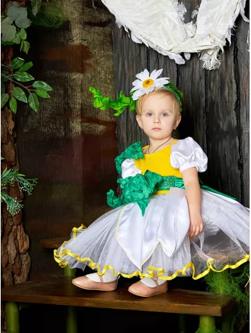 Світлий, теплий та по-дитячому чарівний образ, що втілює чистоту літа, сонячний настрій і красу польових квітів. Біла пишна сукня з легкою фатіновою спідницею та жовтими хвилястими акцентами створює відчуття повітряності й казкової легкості. Зелені декоративні елементи нагадують листочки ромашки та гармонійно доповнюють образ. Це чудовий вибір для оренди карнавальних костюмів на свята весни, виступи й фотосесії.