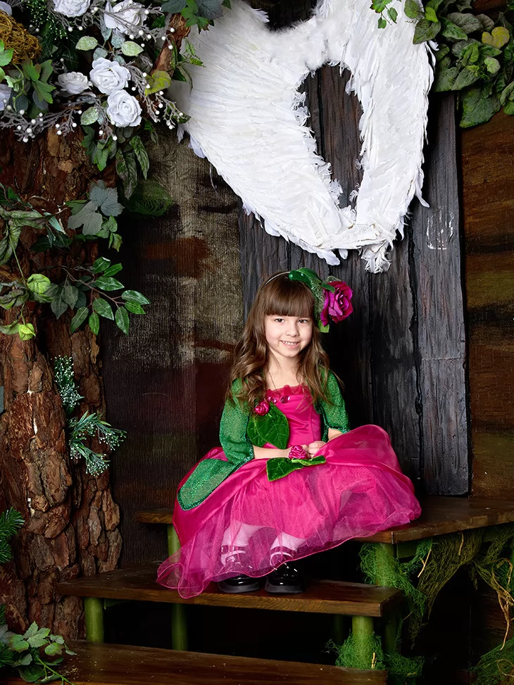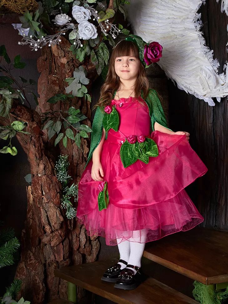Розкішний квітковий образ, що передає красу розквітлої троянди, природну ніжність і святкову чарівність казкового лісу. Насичено-рожева сукня з повітряною багатоярусною спідницею виглядає мов пелюстки троянди, що м’яко розкриваються у русі. Декоративні листочки й квіткові акценти на талії створюють живий природний ефект, а легка зелена накидка додає образу гармонії та завершеності. Це чудовий варіант для оренди карнавальних костюмів на весняні свята, виступи й яскраві фотосесії.