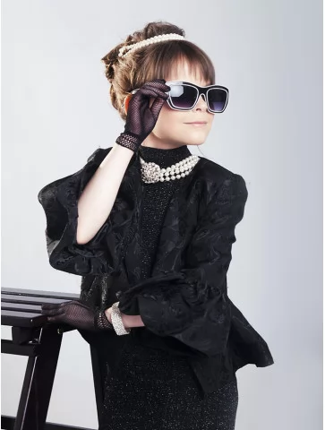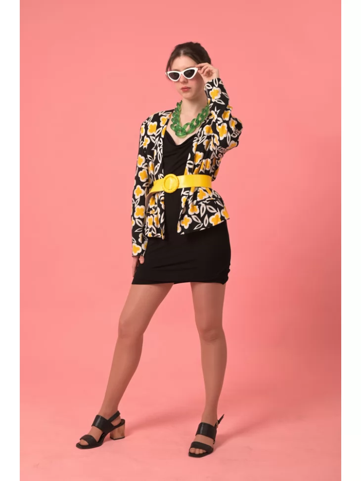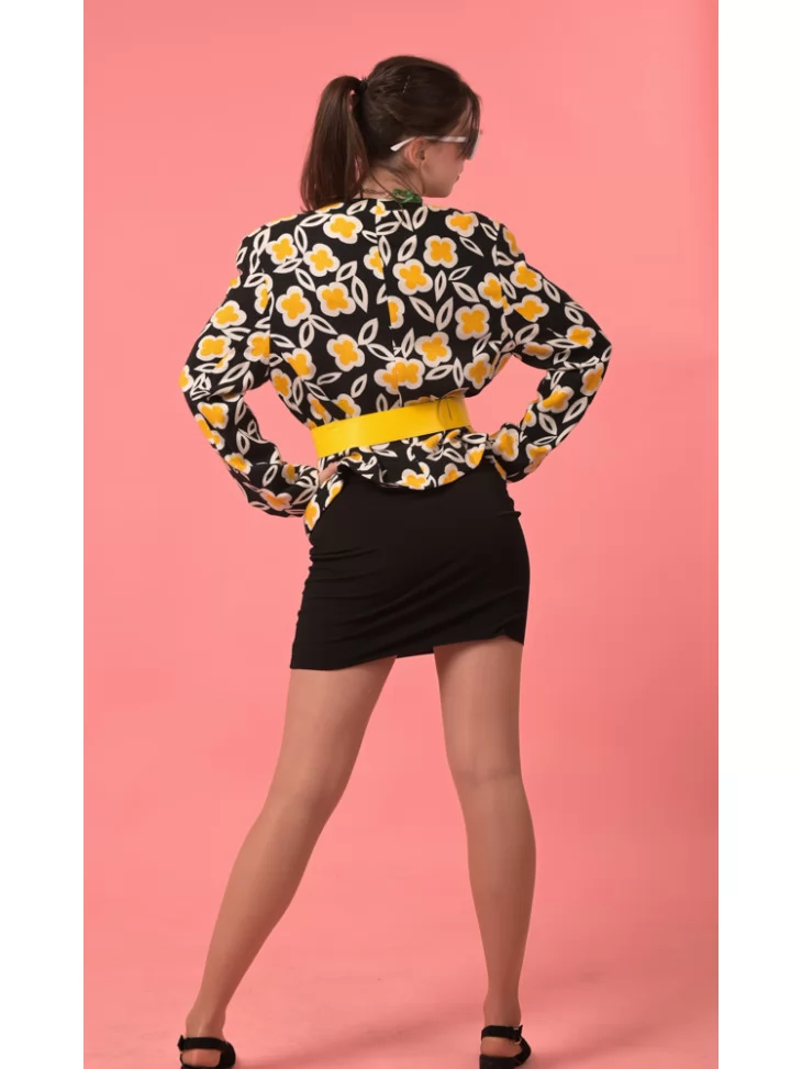 Цей костюм — втілення яскравої енергії диско-діви, яка не боїться бути в центрі уваги. Чорна міні-сукня в поєднанні з жакетом у жовто-білих квітах, глянцевим жовтим паском і ретро-окулярами створюють впізнаваний силует у стилі пізніх 80-х. Образ виглядає стильно, яскраво та з нотками ностальгії. Завдяки послузі оренда карнавальних костюмів, ти зможеш перевтілитися у зірку танцполу навіть на один вечір.
