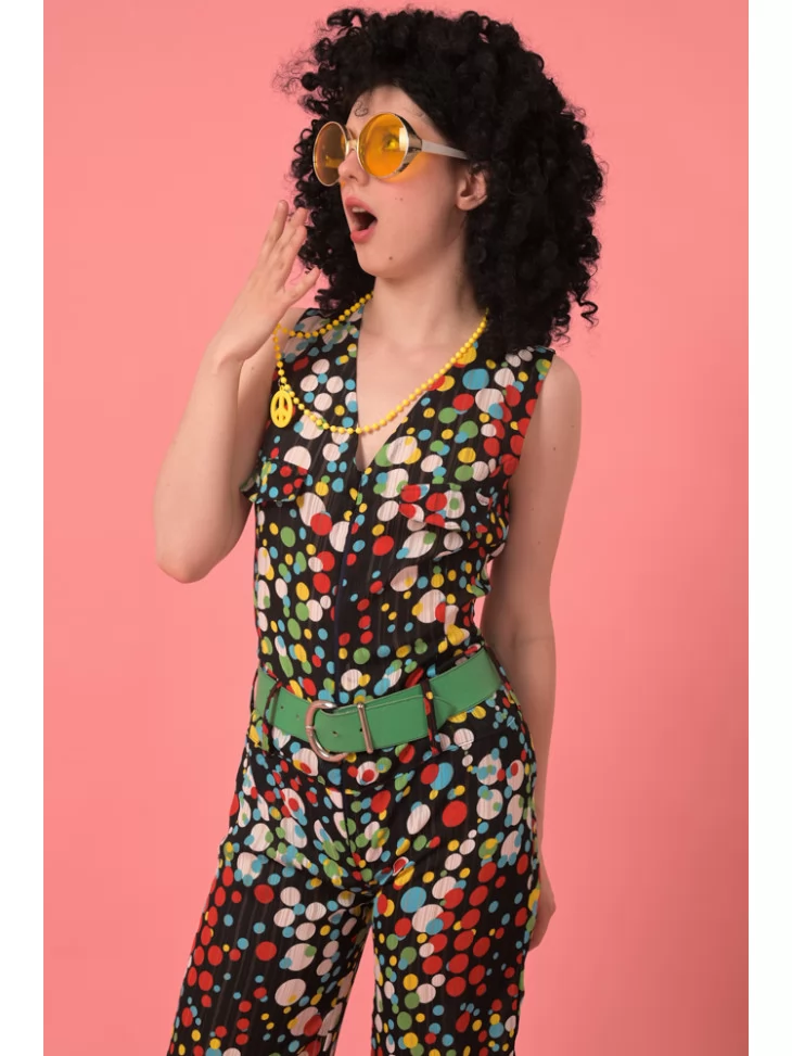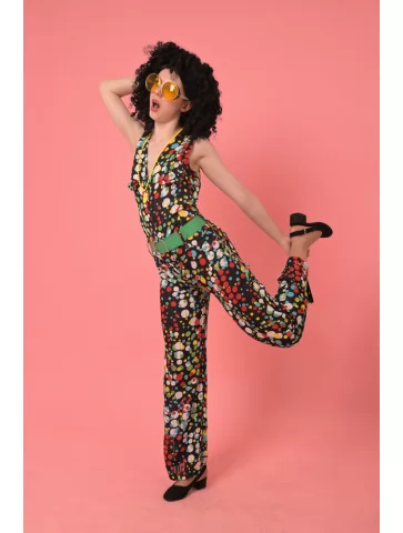 Цей образ — справжнє втілення епохи диско: сміливий, веселий і незабутній. Комбінезон з принтом у стилі поп-арту, великий зелений пасок, кучерява перука та яскраві аксесуари — усе це створює впізнаваний образ королеви танцполу. Завдяки послузі оренда карнавальних костюмів, ти можеш легко перевтілитись у зірку 80-х.
