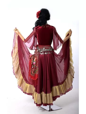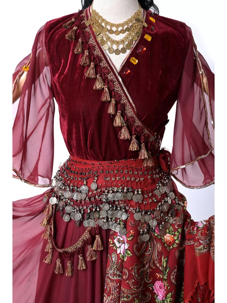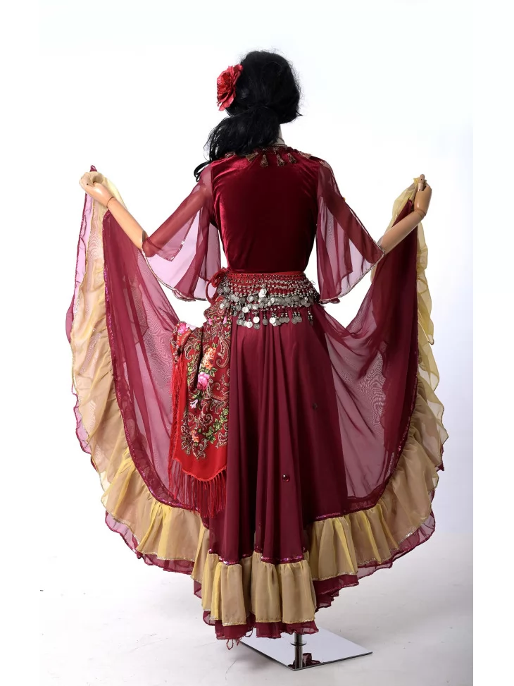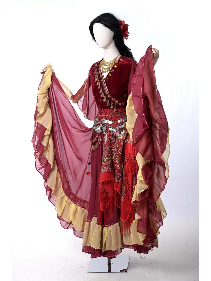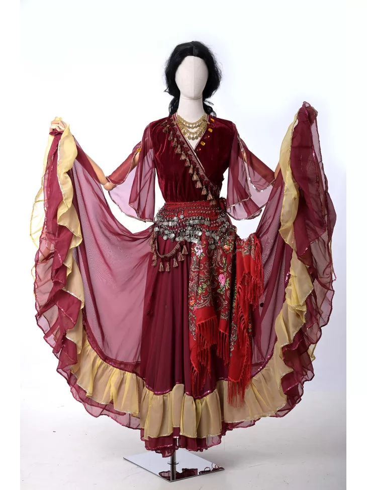 Оренда карнавальних костюмів — чудовий спосіб перевтілитися в яскраву героїню з вогняним характером. Цей циганський образ у глибокому винному кольорі створює відчуття розкоші та свободи руху.