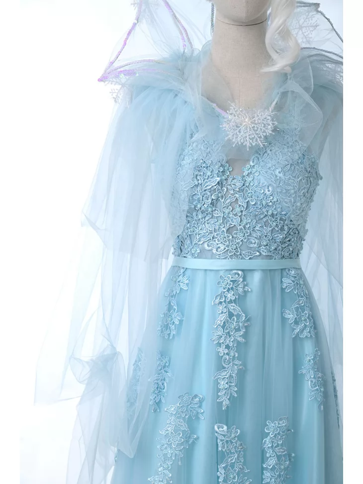 Костюм «Снігова Королева Мерехтливої Величі» — це втілення елегантності, крижаного блиску та царственої грації. Ніжно-блакитна сукня з фактурним верхом і каскадними вставками мережива створює ефект морозного сяйва. Довга фатинова накидка грайливо огортає плечі, а високий фігурний ворот додає вишуканої містичності. Оренда карнавальних костюмів у такому стилі — це шанс засяяти та зробити вас справжньою героїнею зимової казки.