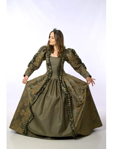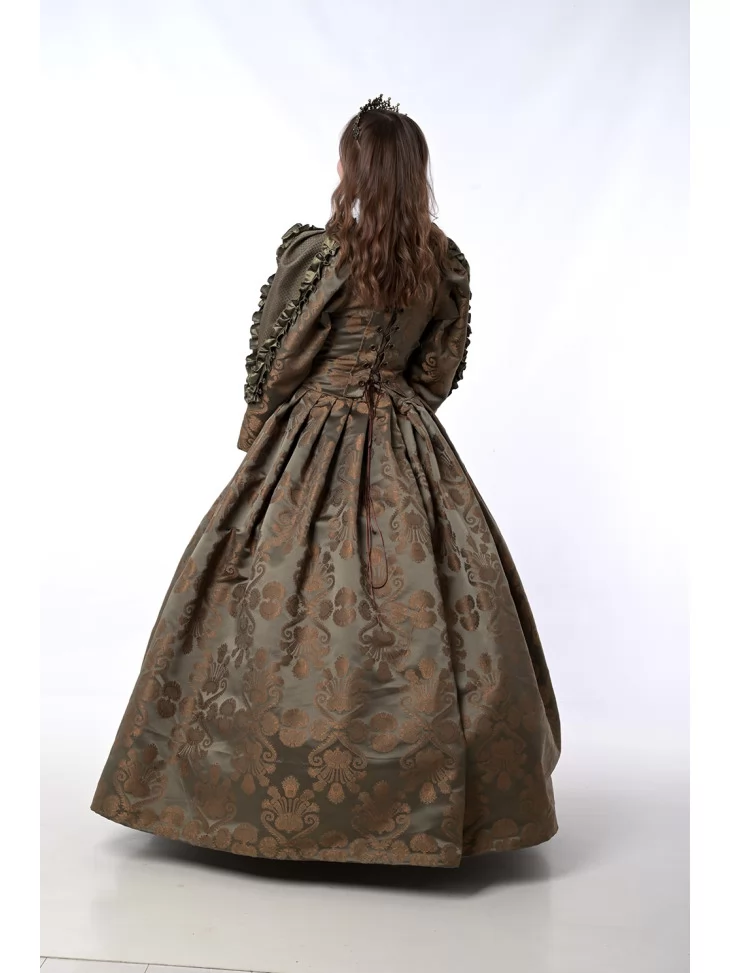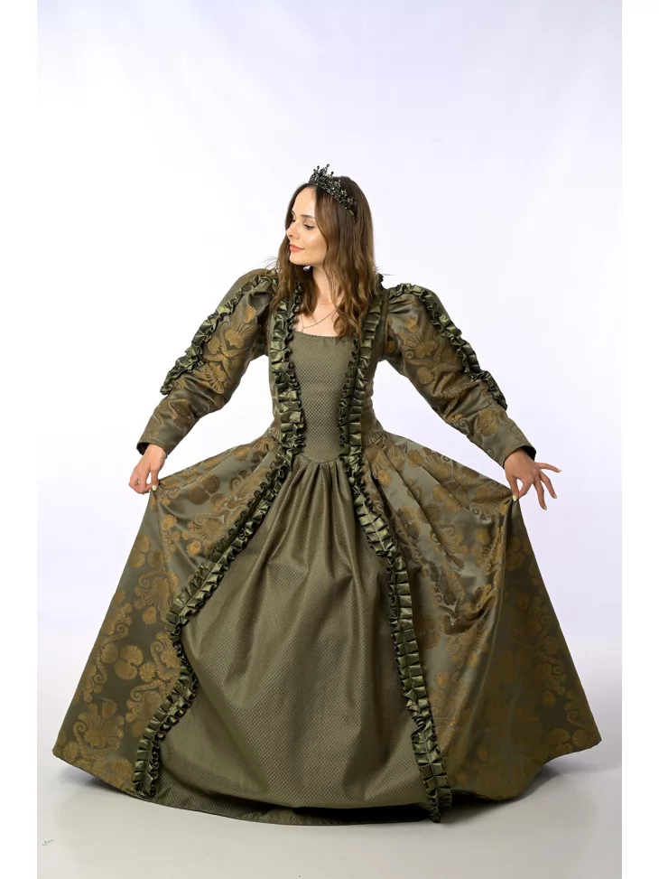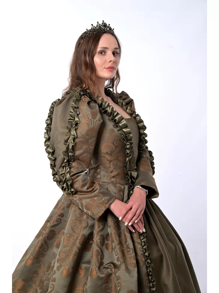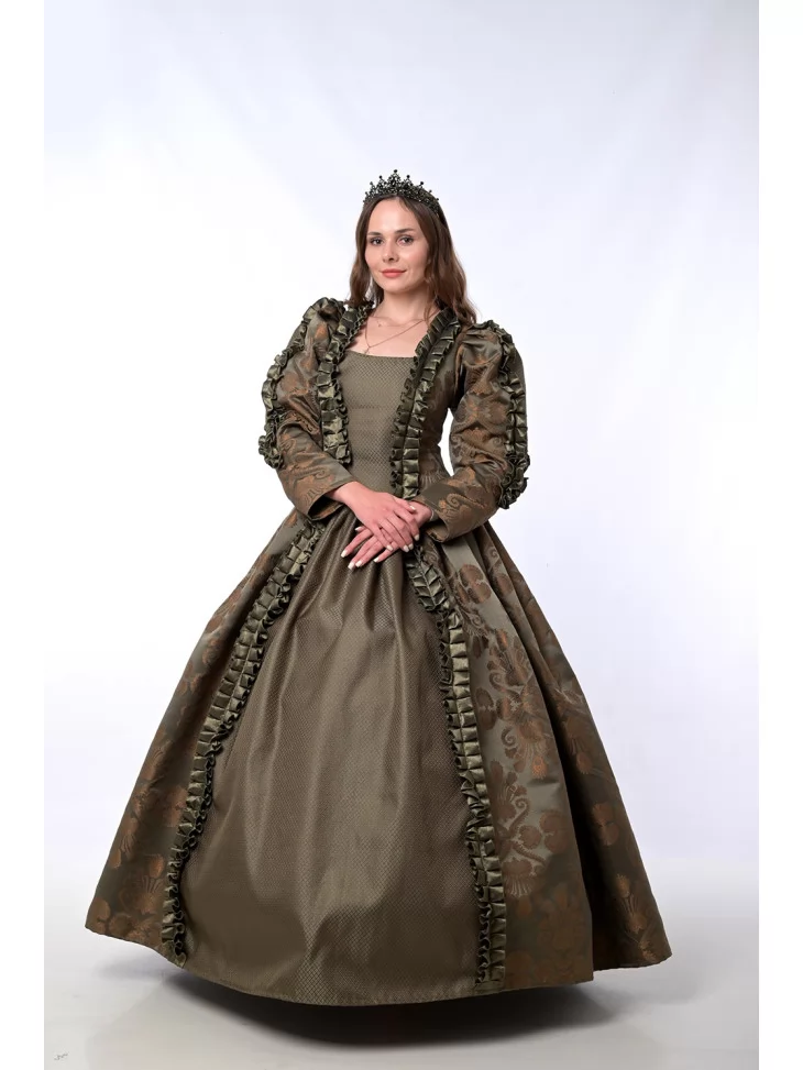 Цей розкішний костюм натхненний епохою Відродження, коли пишність тканин та багатство деталей втілювали високий статус і витонченість. Завдяки благородному оливково-золотому кольору та розкішному оздобленню, костюм створює неповторний образ монаршої персони. Прокат карнавальних костюмів дозволяє легко втілити історичний персонаж — чи то на сцені, чи на святі.