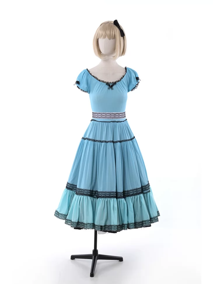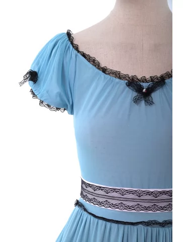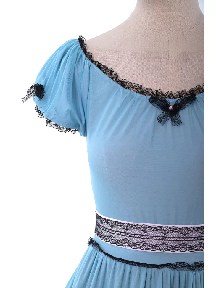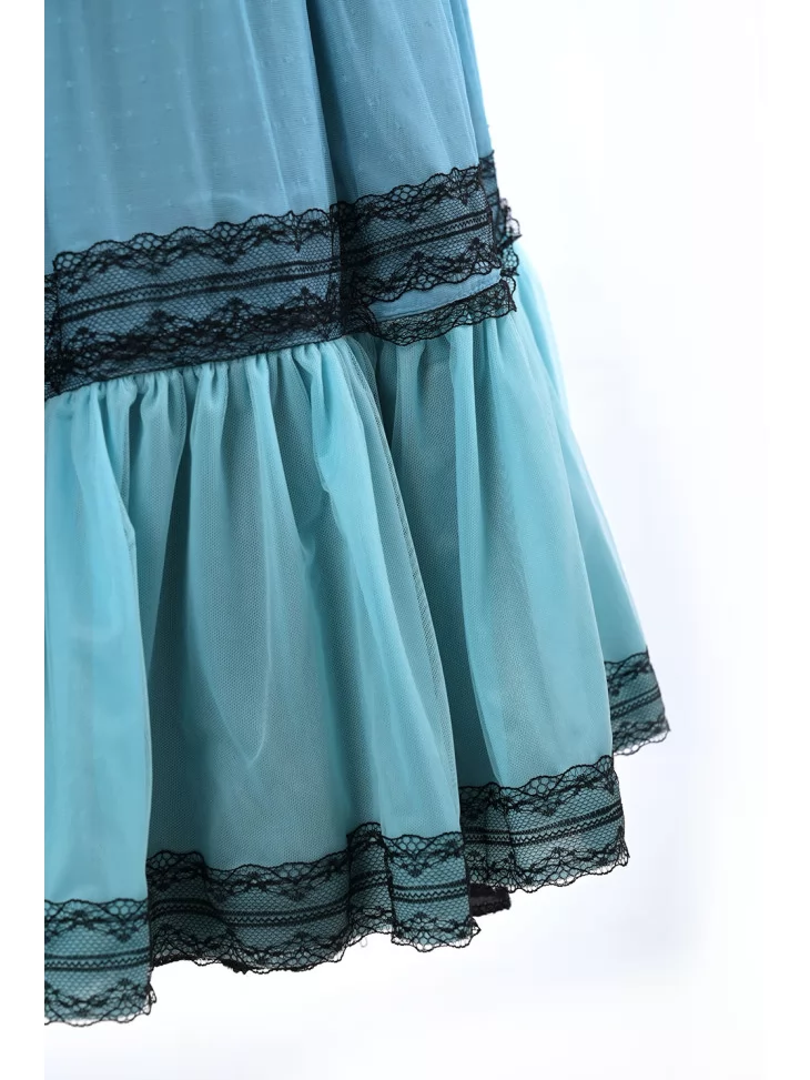 – легка сукня середньої довжини у відтінках блакитного з оздобленням чорним мереживом