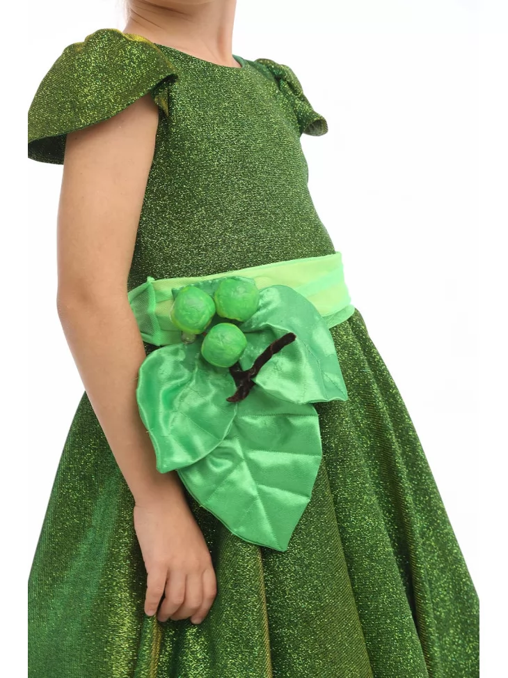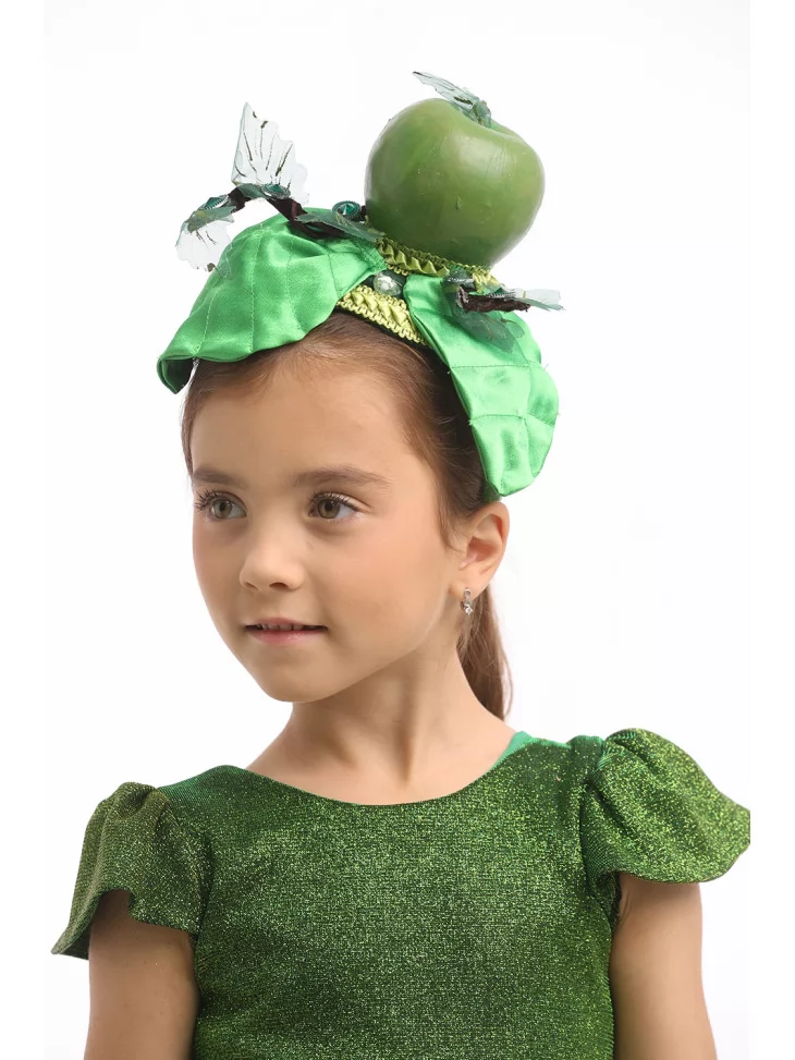 – на голові — обруч із великим зеленим яблуком, листочками і блискітками, що створює завершений фруктовий образ