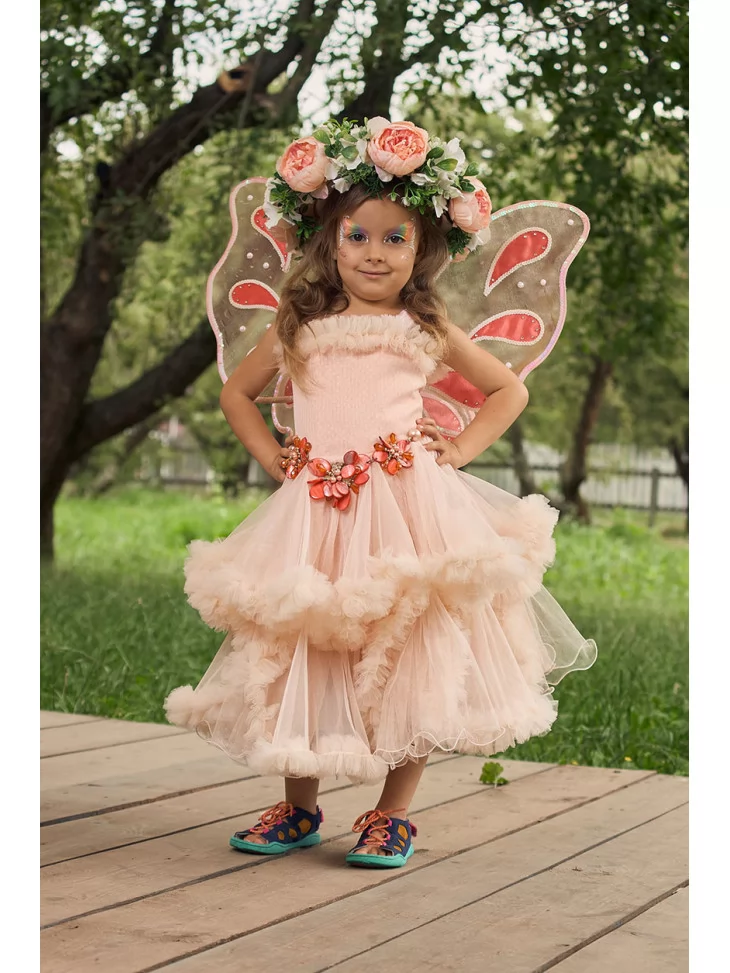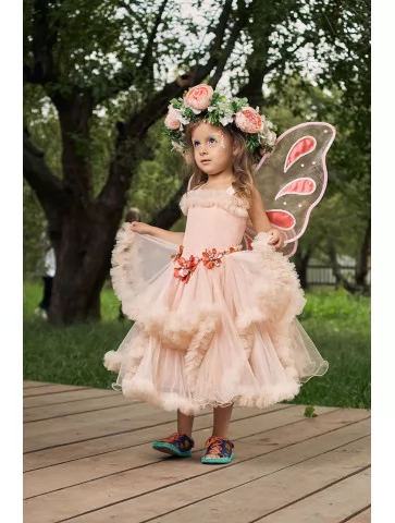 Оренда карнавальних костюмів — це чудова можливість подарувати дитині чарівну роль на святі, фотосесії чи виступі. Образ феї у персиковому кольорі — легкий, яскравий і повністю казковий. Повітряна сукня, блискучі крила та розкішний віночок з квітами створюють справжню атмосферу весняного саду.