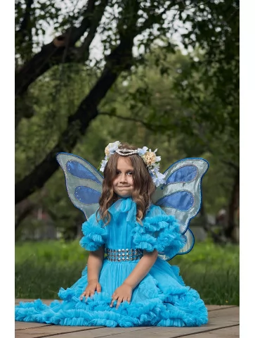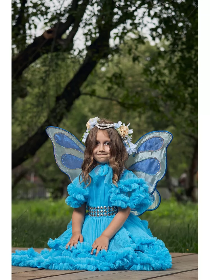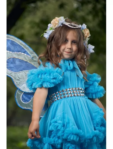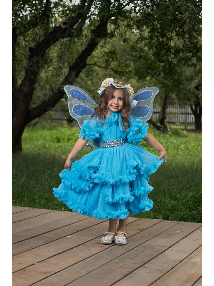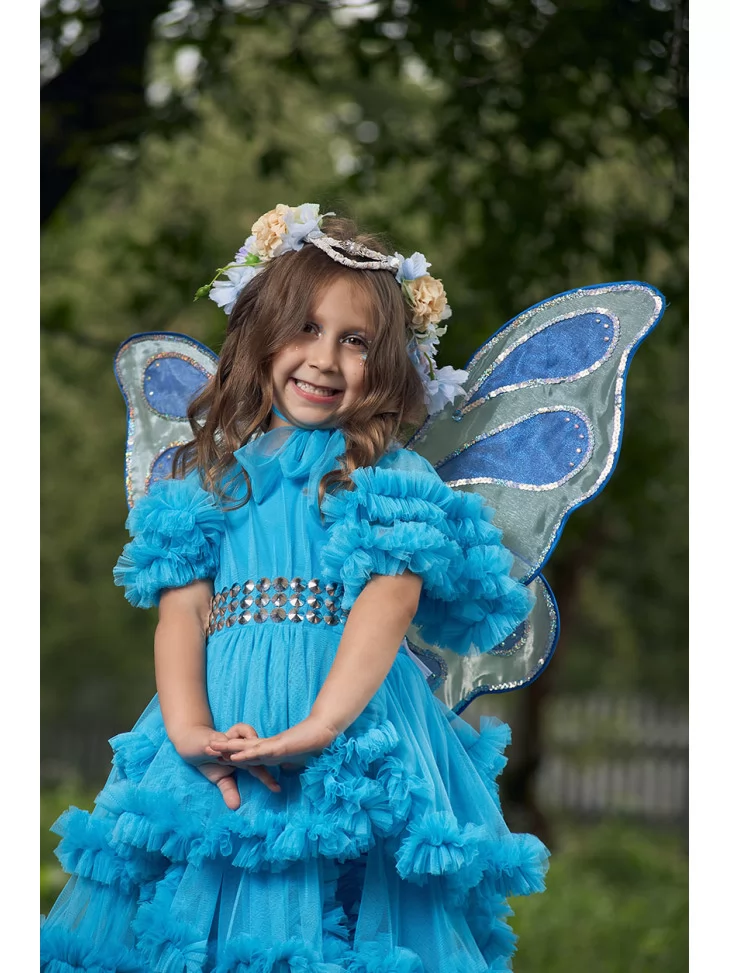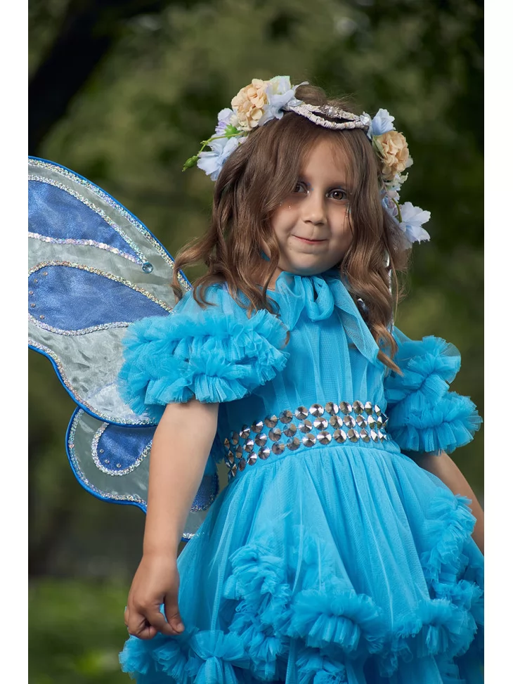 Яскравий святковий образ можна легко створити, скориставшись орендою карнавальних костюмів. Цей костюм феї у насиченому блакитному кольорі ніби зійшов із сторінки дитячої казки. Пишна сукня, мерехтливі крила та квітковий вінок створюють ідеальне поєднання для дівчинки, яка мріє перевтілитися у магічну істоту.