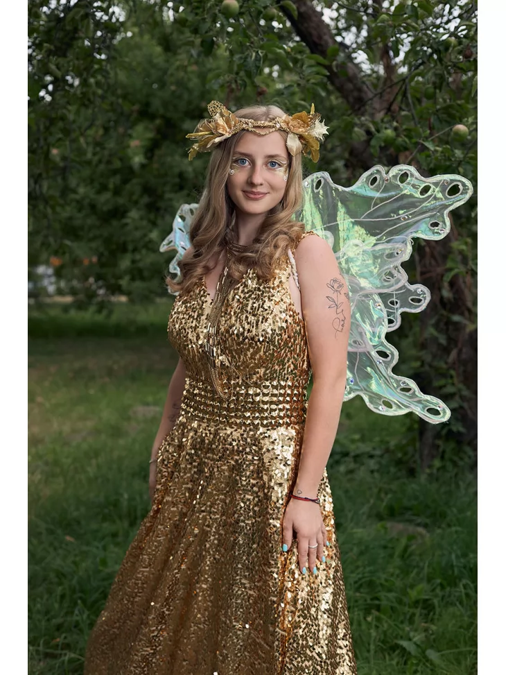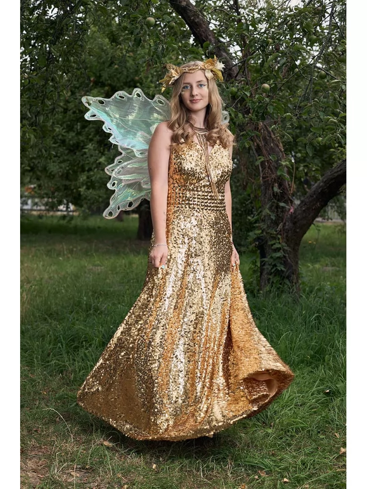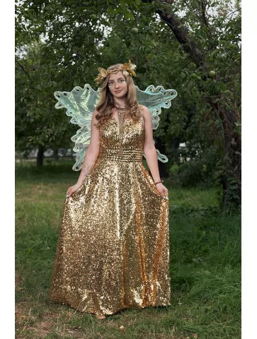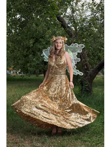 У пошуках образу, який поєднує у собі розкіш і магію, зверніть увагу на костюм Золотої Феї. Він ідеально підходить для прокату карнавальних костюмів на свята, фотосесії або сценічні виступи. У ньому неможливо залишитися непоміченою — кожен рух переливається золотими відблисками.