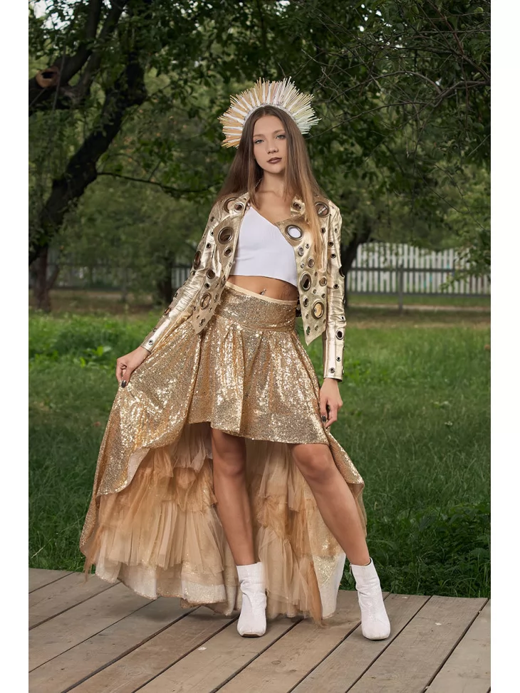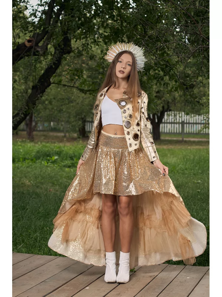 – асиметрична спідниця з паєтками — коротка спереду та з ефектним довгим шлейфом з фатину ззаду