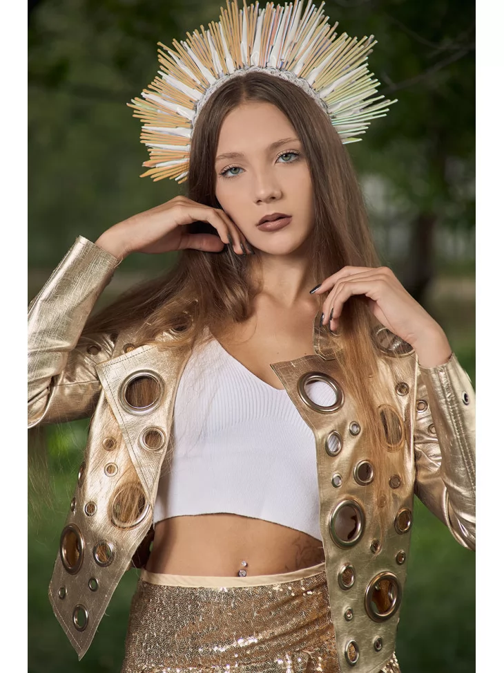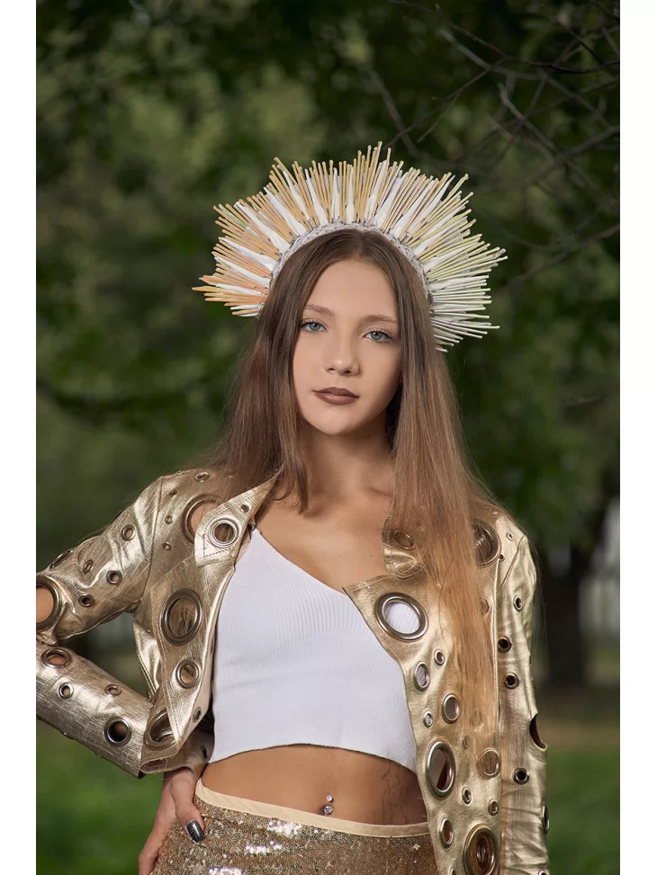 – золотистий головний убір у вигляді променевого вінця — фінальний акцент