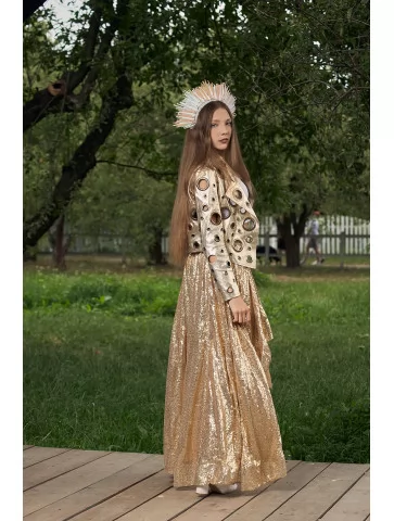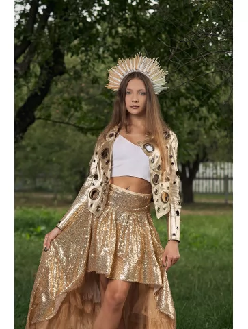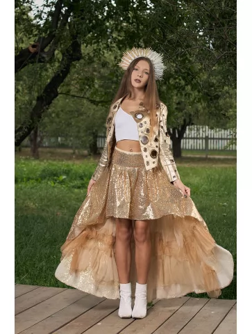 костюм у золотистому стилі з асиметричною спідницею та піджаком