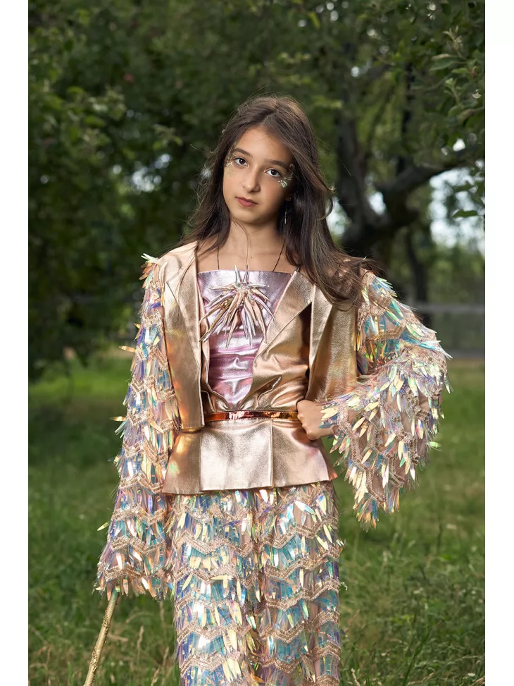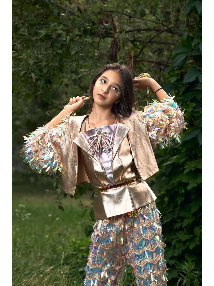 Цей костюм у стилі блискучого диско виглядає сучасно, екстравагантно та ідеально підходить для виступів, фотосесій або святкових подій. Костюм складається з трьох основних елементів, кожен з яких оздоблений яскравими паєтками та декоративними елементами, що ефектно мерехтять при русі. Оренда карнавальних костюмів дає змогу легко приміряти на себе цей незабутній образ без необхідності покупки.