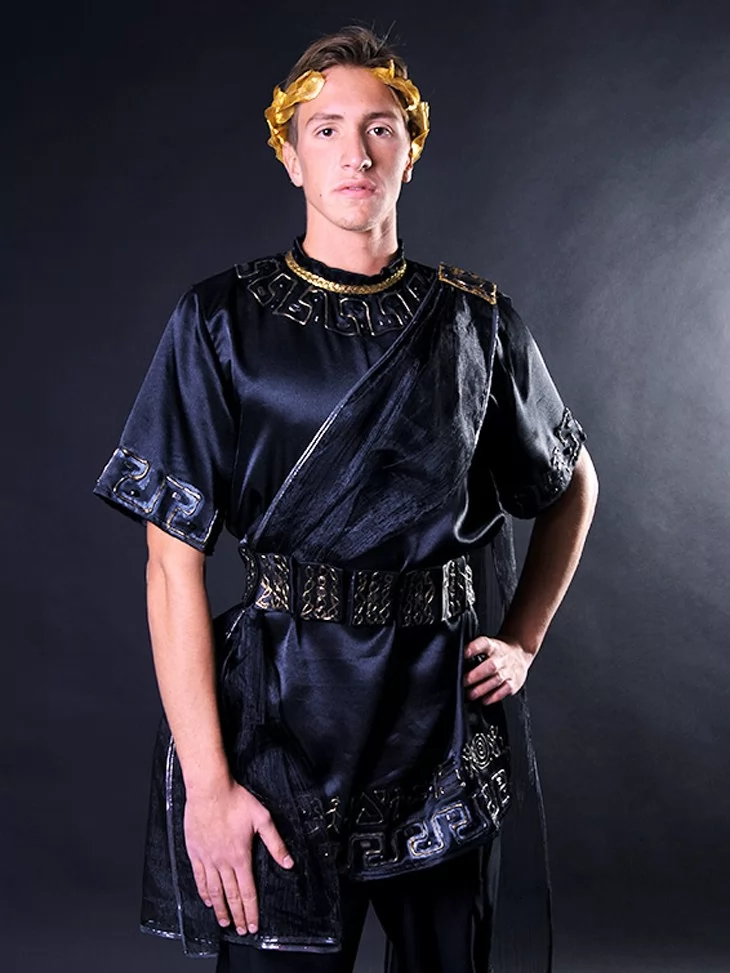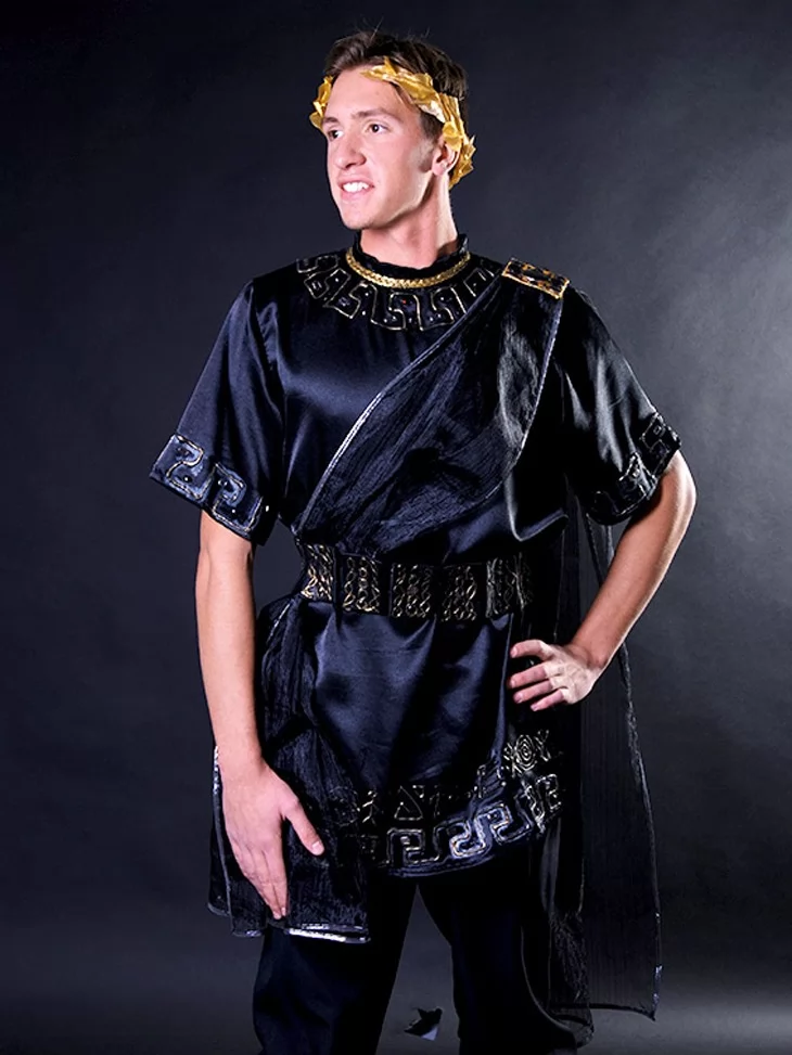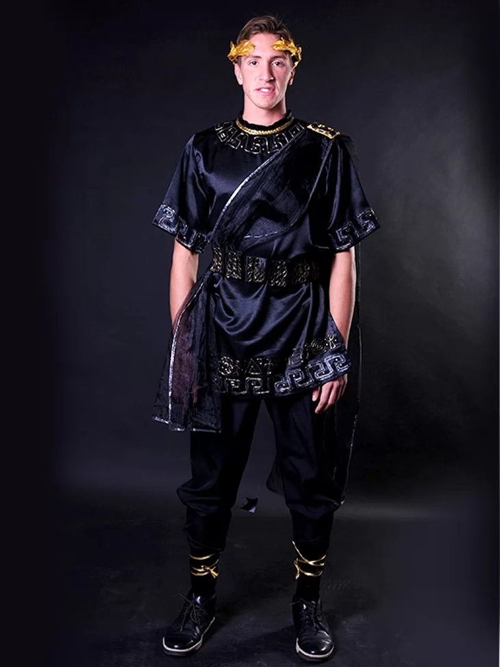 Карнавальний костюм «Чорний Володар Олімпу» створено для тих, хто прагне виглядати ефектно та вишукано. Поєднання глибокого чорного кольору з золотими акцентами додає образу величі й таємничості. Такий костюм легко уявити на могутньому Зевсі, Аїді або міфічному правителеві еллінського світу.