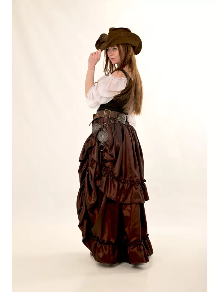 – пишна довга спідниця кольору гіркого шоколаду з глянцевої тканини, з драпіруванням і рюшами