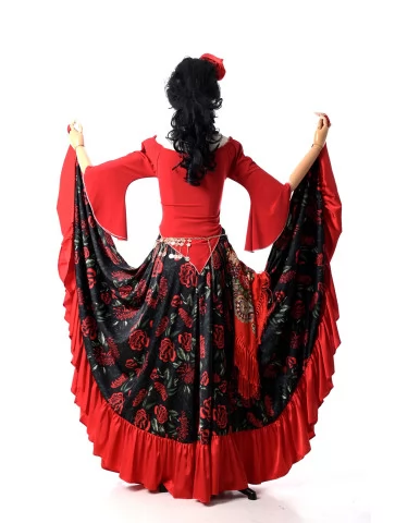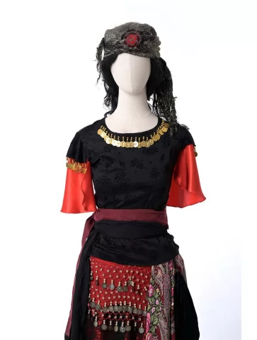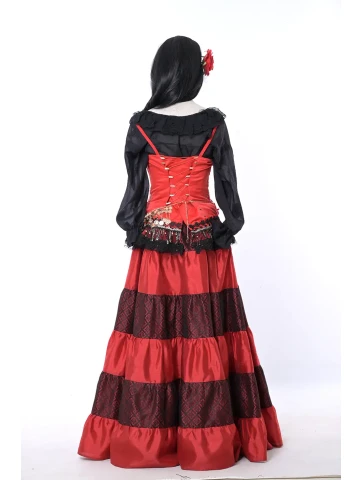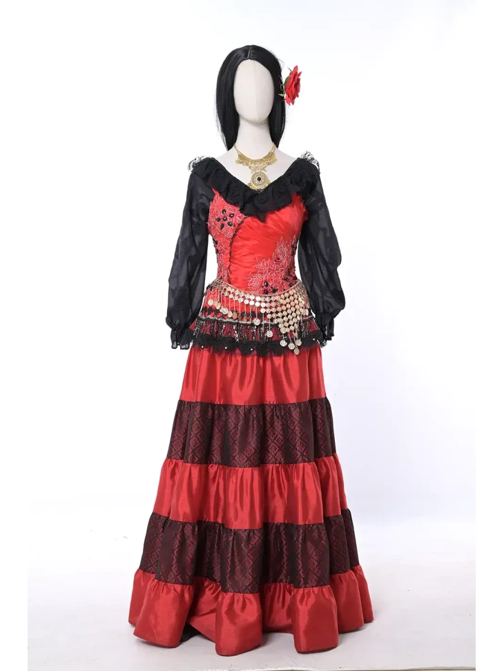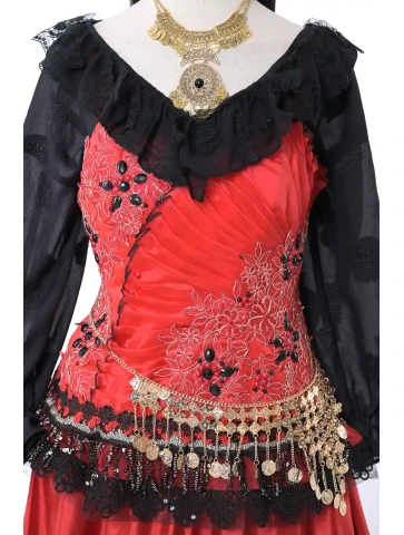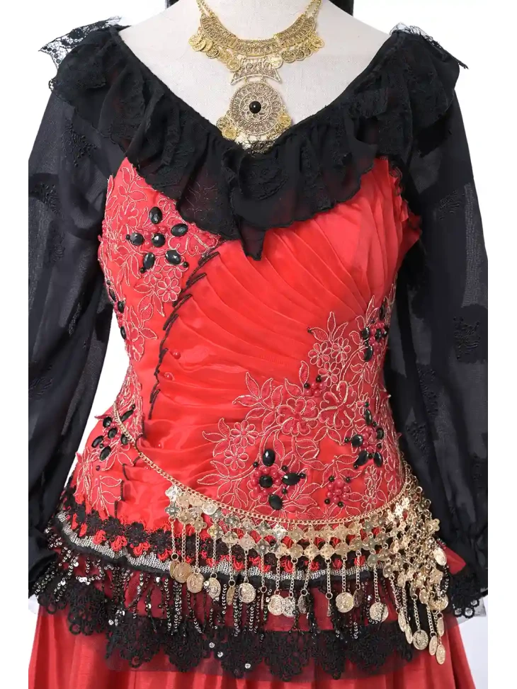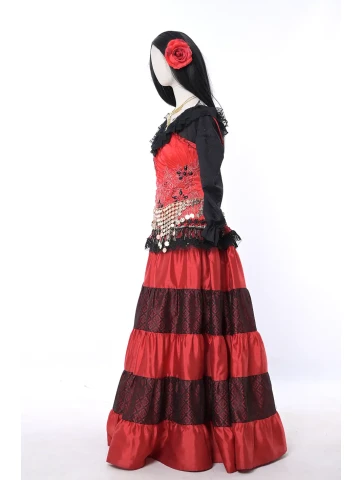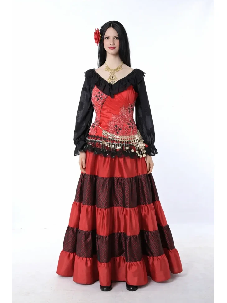 Яскравий і темпераментний образ у стилі циганського фольклору, сповнений кольору, руху та сценічної виразності. Насичений червоний корсет у поєднанні з багатоярусною спідницею створює ефектний силует, а чорна напівпрозора блуза додає образу загадковості. Пояс із монетками та декоративна прикраса на шию підкреслюють характерний стиль циганських танців і святкових виступів. Такий образ чудово підходить для оренди карнавальних костюмів на тематичні вечірки, виступи або яскраві фотосесії.