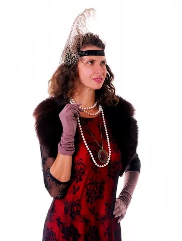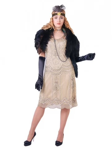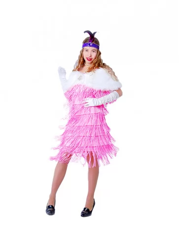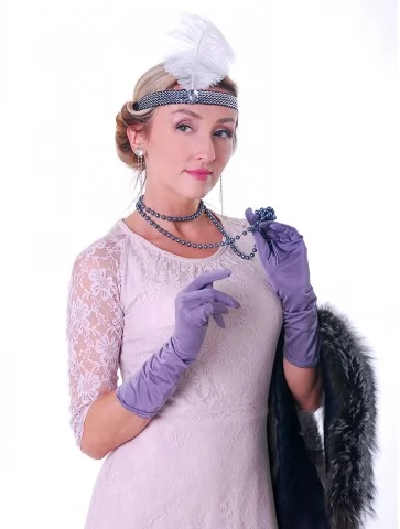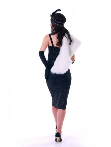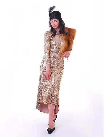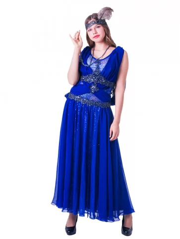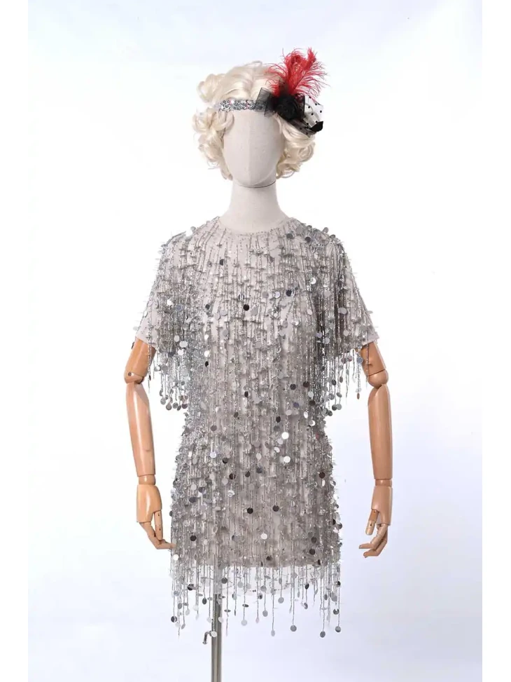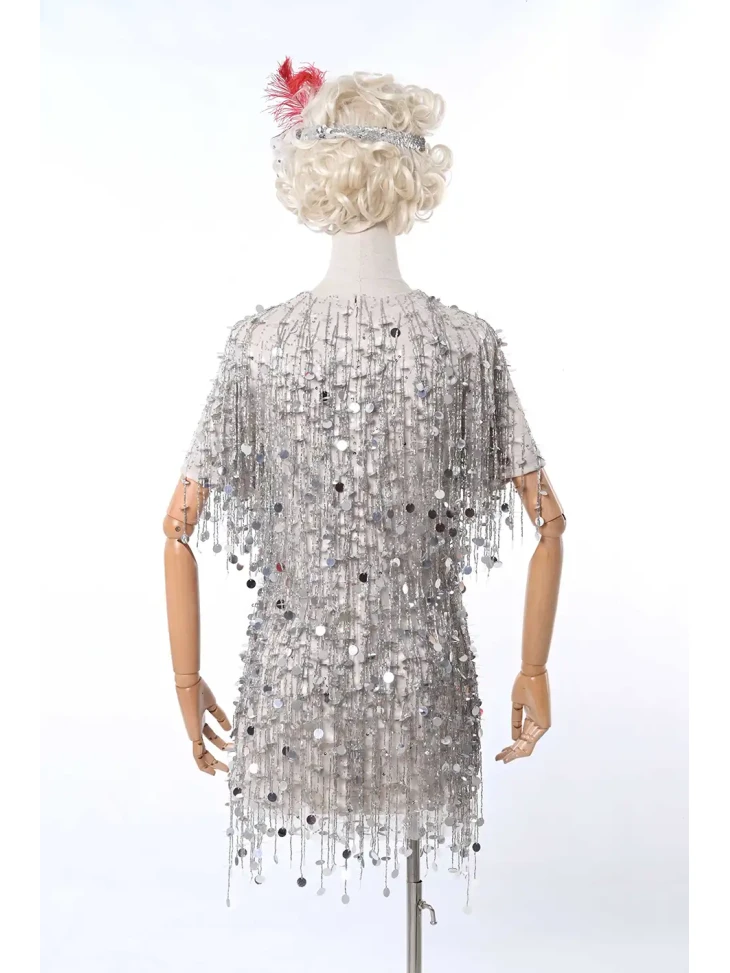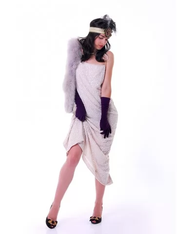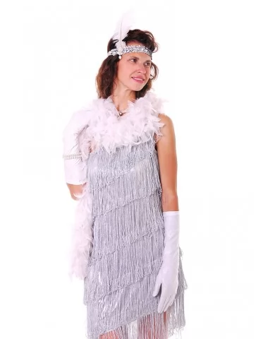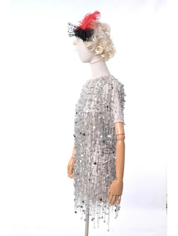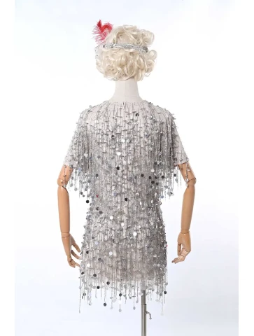 Ефектний образ у стилі ретро-Голлівуду, натхненний атмосферою джазових вечірок, блиском сцени та елегантністю культових ікон кіно. Срібна сукня, щедро прикрашена блискучими елементами та нитками паєток, створює розкішний ефект руху й сяйва під світлом софітів. Легка бахрома додає образу динаміки, а декоративний головний убір з пір’ям підкреслює витончену атмосферу епохи. Такий образ стане чудовим вибором для оренди карнавальних костюмів на тематичні вечірки, фотосесії або сценічні виступи у стилі ретро.