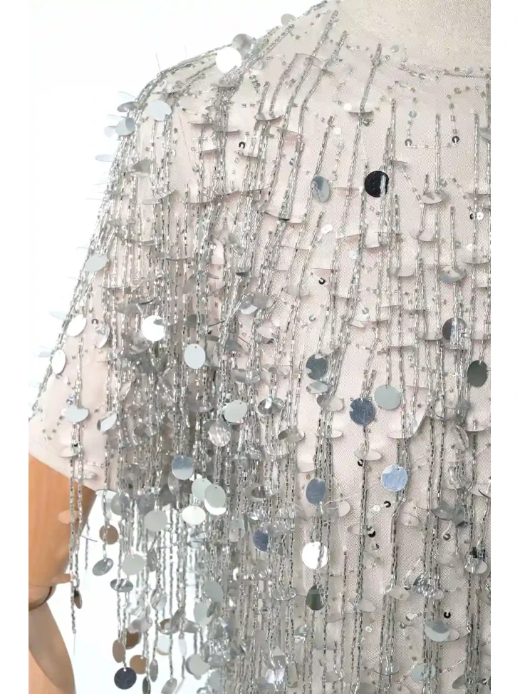 – срібна сукня з декоративною бахромою та блискучими елементами