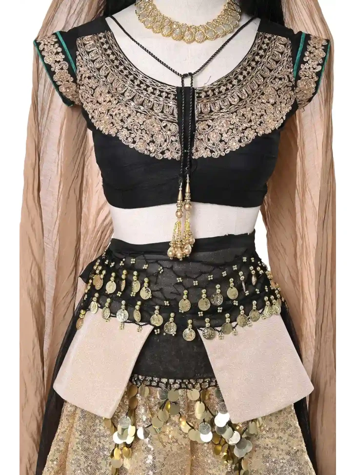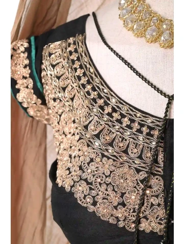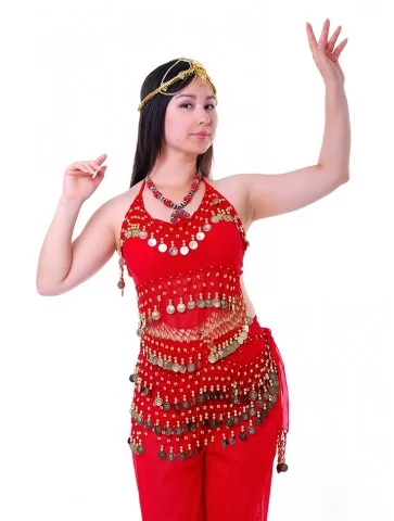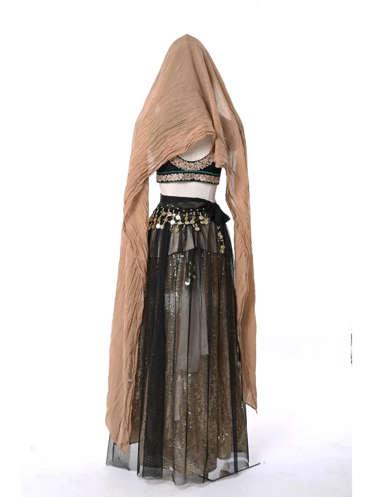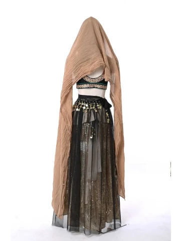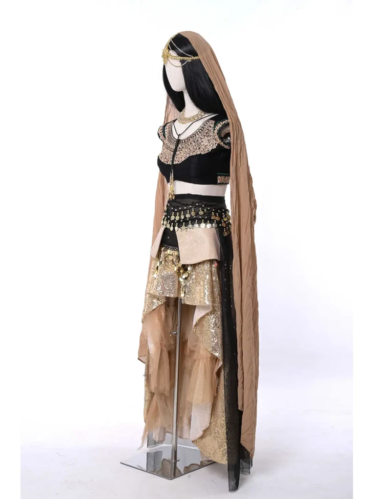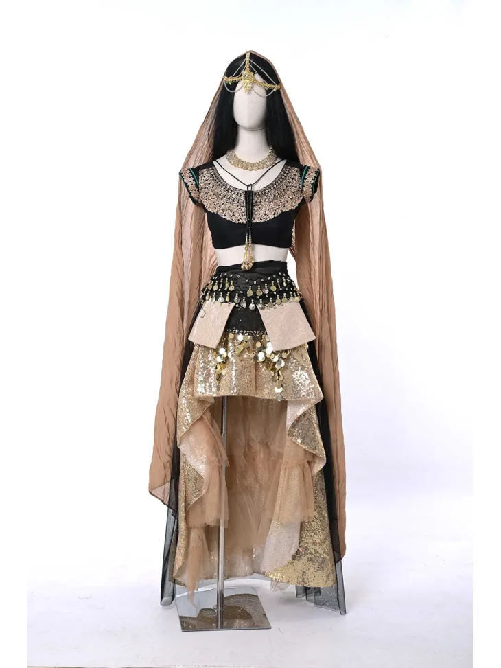Розкішний східний образ, натхненний легендами Персії, палацовими святами та атмосферою тисячі й однієї ночі. Багатий декор із золотими елементами, блискуча багатошарова спідниця та витончений топ створюють ефектний силует справжньої принцеси. Декоративний пояс із монетками, прикраси та довга вуаль додають образу загадковості й східної елегантності. Такий костюм виглядає дуже сценічно та стане чудовим вибором для оренди карнавальних костюмів на тематичні вечірки, фотосесії або виступи.