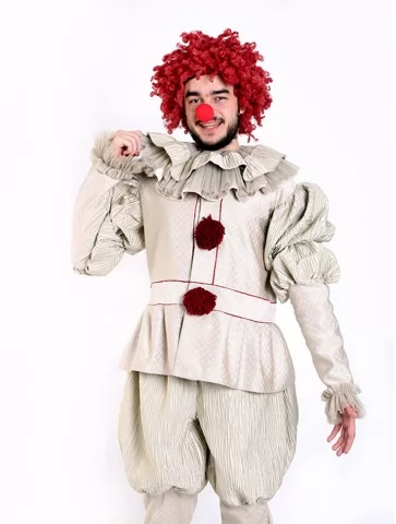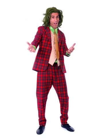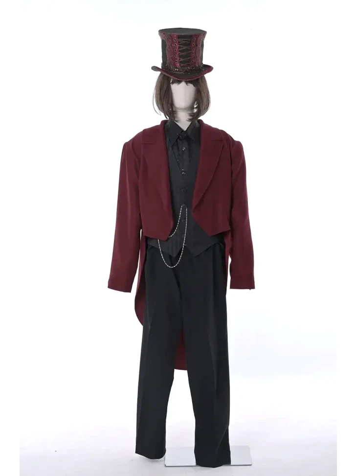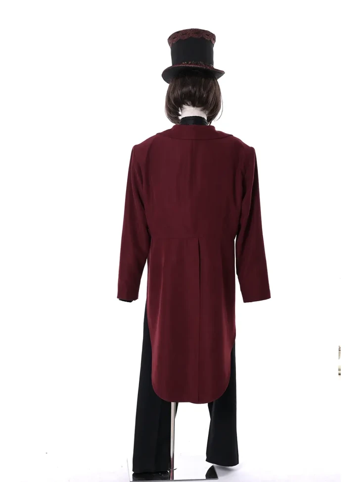 Ексцентричний і впізнаваний образ легендарного власника шоколадної фабрики, сповнений загадковості, шарму та театральної елегантності. Бордовий фрак у поєднанні з чорним костюмом створює стильний силует, що відразу асоціюється з харизматичним персонажем із казкового світу солодощів. Високий декоративний циліндр додає образу особливого характеру та робить його яскравим і сценічним. Такий костюм стане чудовим вибором для оренди карнавальних костюмів на тематичні вечірки, виступи або креативні фотосесії.