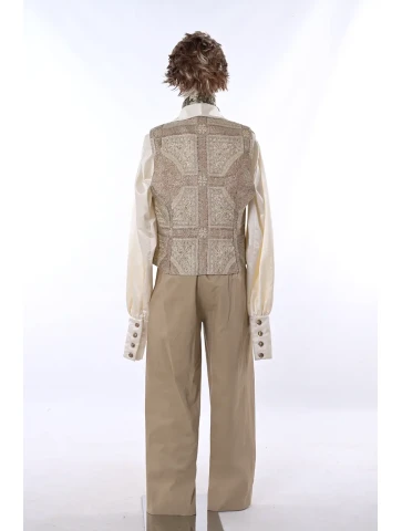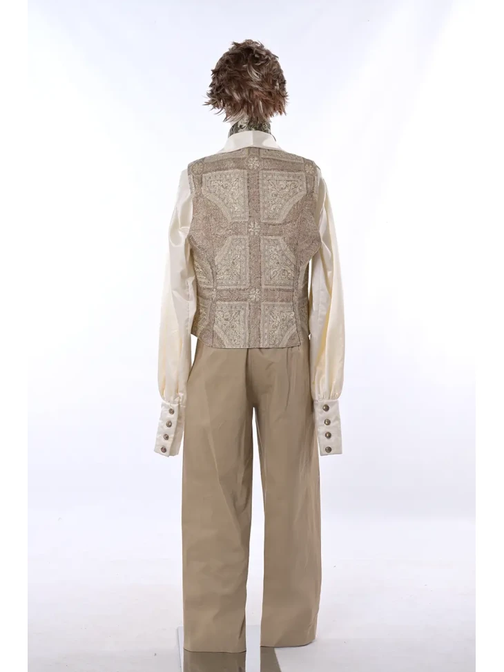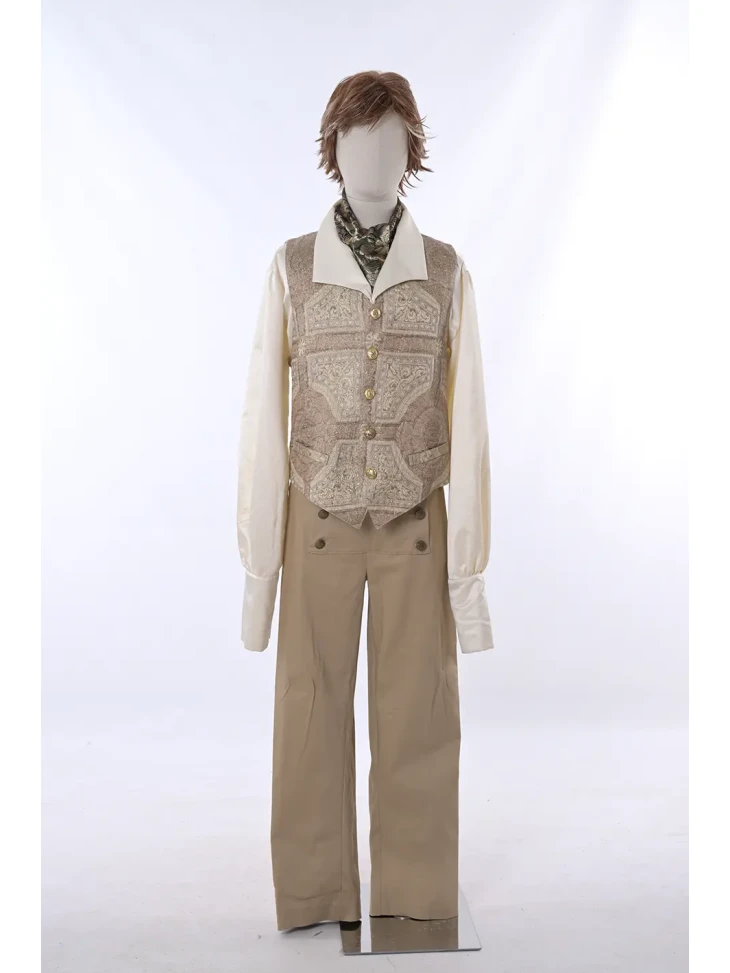 Вишуканий історичний образ, натхненний атмосферою світських балів та романтики епохи регентства.Елегантний жилет із декоративним орнаментом, класична сорочка та світлі штани створюють витончений силует справжнього джентльмена з аристократичних салонів. Стильний шийний аксесуар доповнює образ і додає йому благородного характеру. Такий костюм стане чудовим вибором для оренди карнавальних костюмів на тематичні вечірки, історичні фотосесії або театральні постановки.
