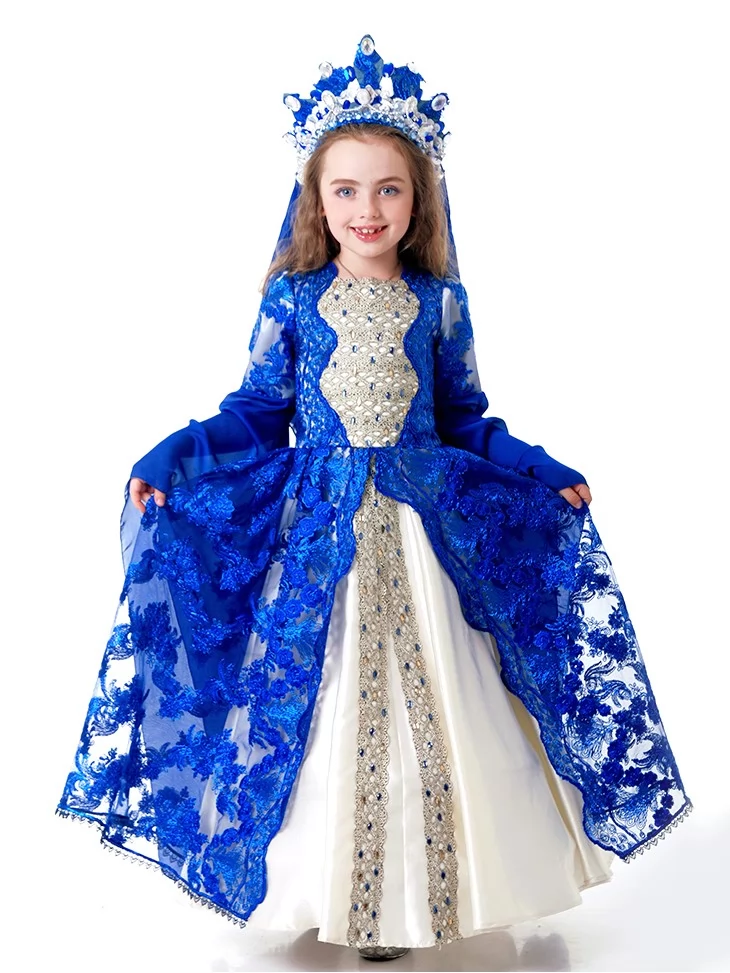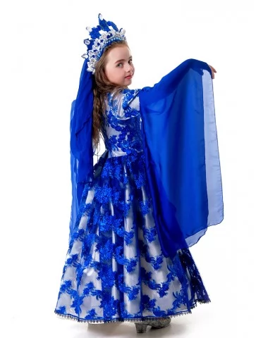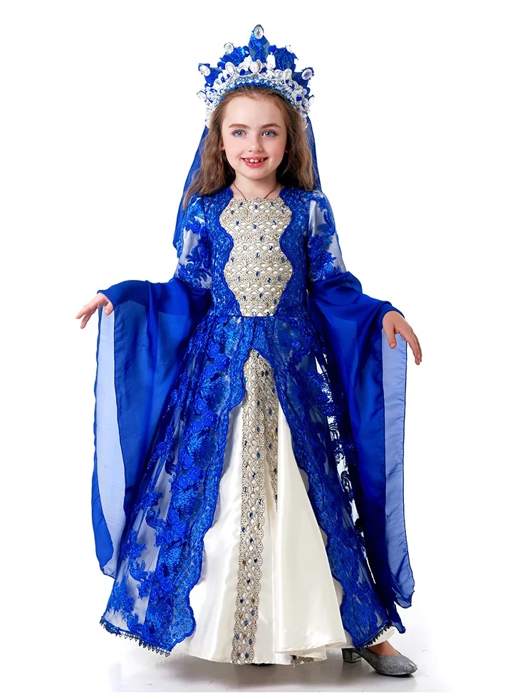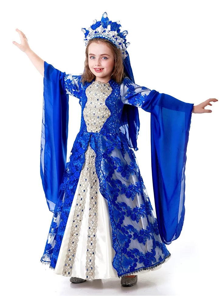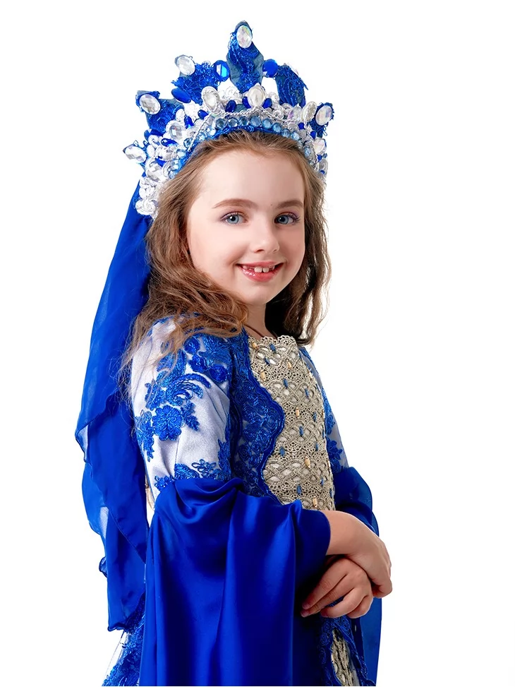 Розкішний палацовий образ, натхненний легендами Сходу, величчю гарему та жіночою силою при султанському дворі. Глибокий сапфіровий колір у поєднанні з молочно-білою сукнею, мереживною накидкою та короною створює образ справжньої східної правительки — витонченої, впевненої й урочистої. Цей костюм ідеально підходить для оренда карнавальних костюмів, коли потрібен яскравий, впізнаваний та сценічно сильний образ для дитини.