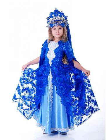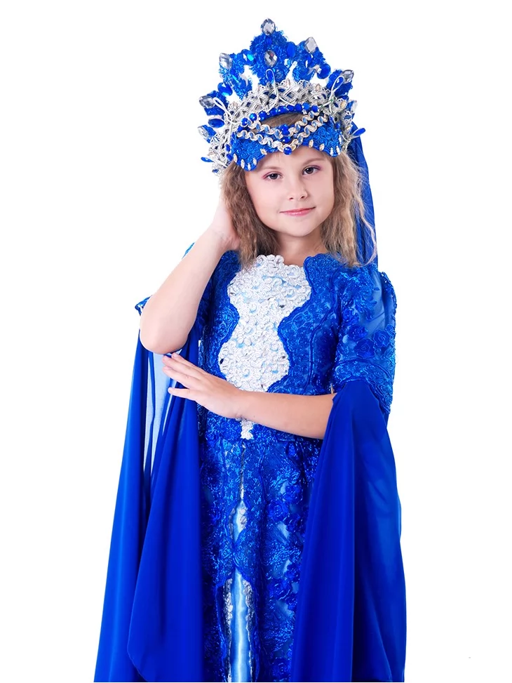 Розкішний і урочистий образ справжньої східної володарки, сповнений благородства, сили та магії палаців Сходу. Насичений синій колір символізує мудрість і велич, а сріблястий декор та мереживна накидка створюють ефект коштовних тканин і королівської присутності. Образ виглядає монументально, святково й дуже сценічно — ідеальний вибір для оренда карнавальних костюмів, коли потрібен яскравий персонаж із статусом.