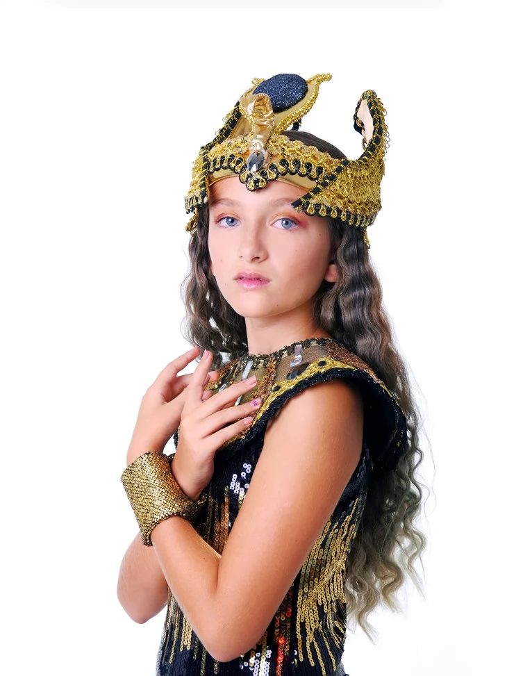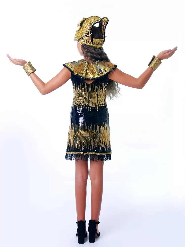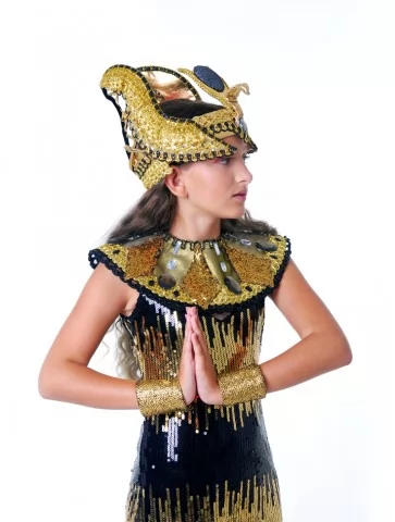 Розкішний сценічний образ, що втілює велич, владу та магію Давнього Єгипту. Чорна сукня, щедро декорована золотими паєтками, створює ефект сяйва під світлом сцени, а контрастний єгипетський комір підкреслює королівський статус образу. Вишукана корона з символікою фараонів і золоті браслети завершують образ справжньої цариці, яка керує поглядом і увагою з першої секунди. Це ідеальний вибір для оренда карнавальних костюмів, коли потрібен яскравий, впізнаваний і фотогенічний персонаж.
