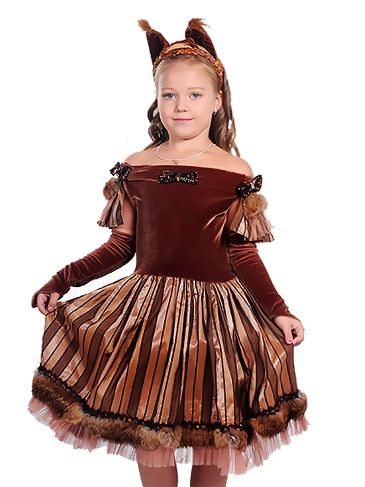 Глибокий карамельний відтінок, м’який оксамит і справжній осінній настрій. Цей костюм Білочки виглядає вишукано та дуже святково. Оксамитовий верх насиченого шоколадного кольору поєднується з пишною спідницею з золотистими переливами, створюючи ефект теплої осені. Декоративне оздоблення по низу та пухнасті акценти додають образу казкової виразності. Ідеальний варіант для оренди карнавальних костюмів на дитячі свята, вистави та тематичні заходи.