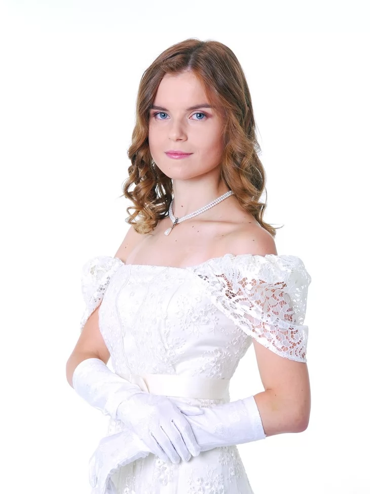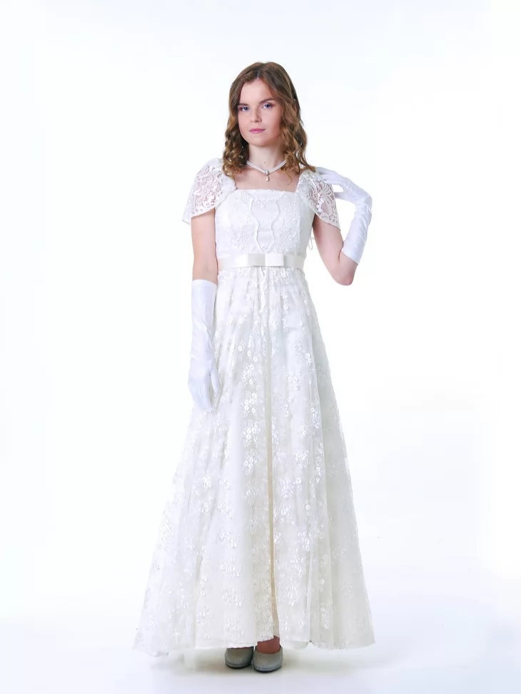 Цей білий ампірний костюм створює образ шляхетної дами з початку ХІХ століття — чистий, елегантний та надзвичайно жіночний.
