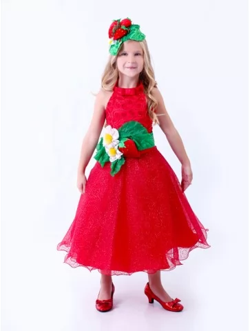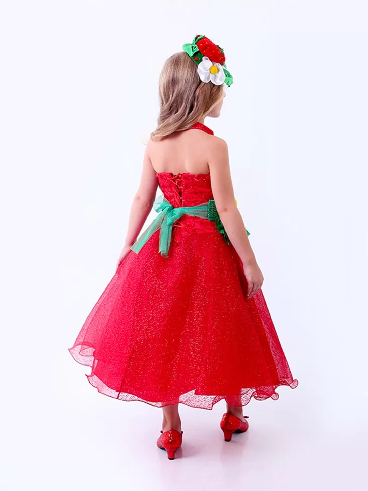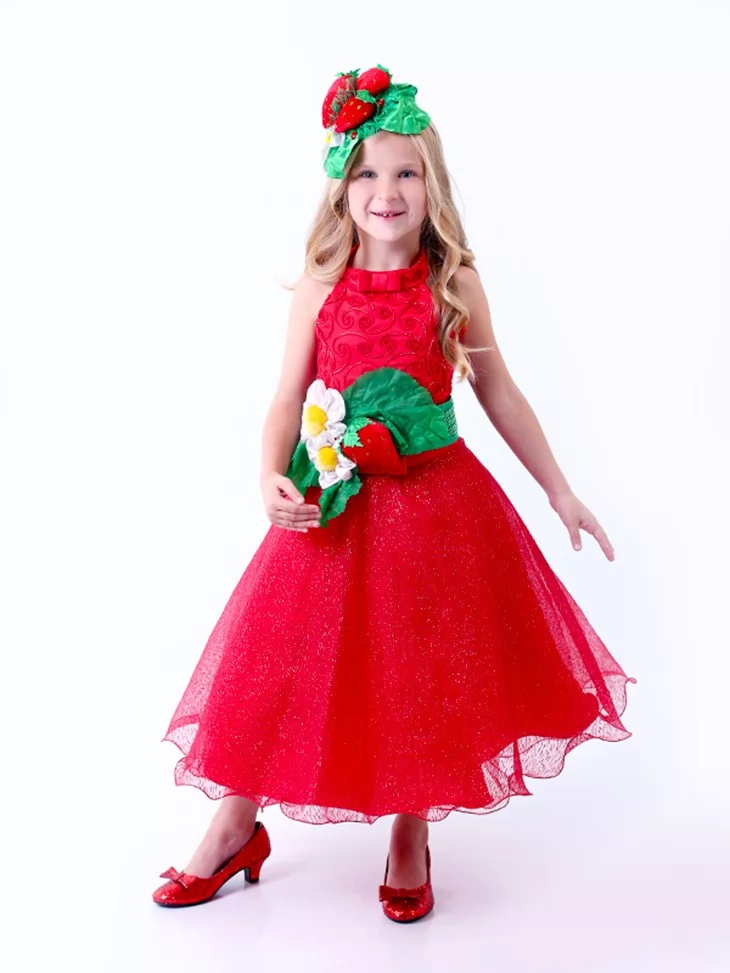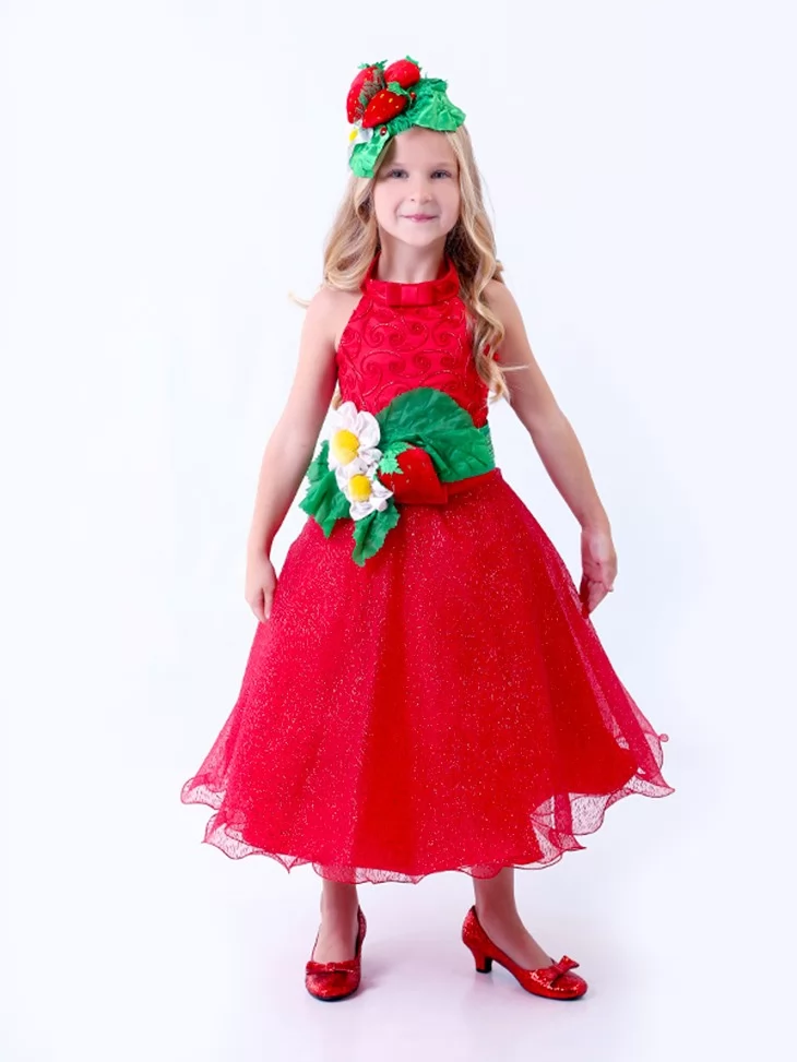Яскравий, соковитий та дуже ефектний образ, що виглядає по-справжньому святково. Насичена червона сукня з легкою блискучою спідницею гарно переливається у русі, а зелений пояс із полуничкою та квіткою додає образу ніжності й літнього настрою. Цей варіант чудово підходить для оренди карнавальних костюмів на дитячі ранки, фотосесії та тематичні заходи. Пишний силует виглядає урочисто, а декоративний головний убір із ягодами гармонійно завершує образ.