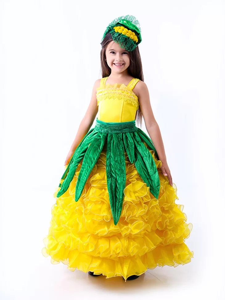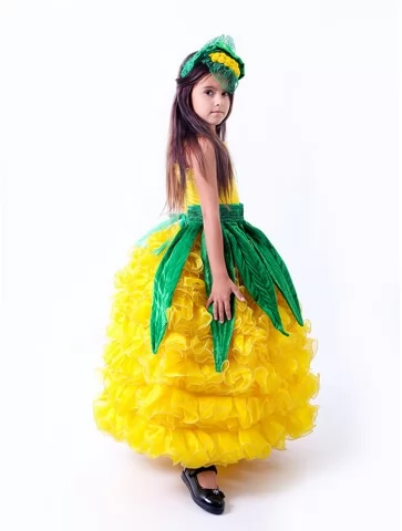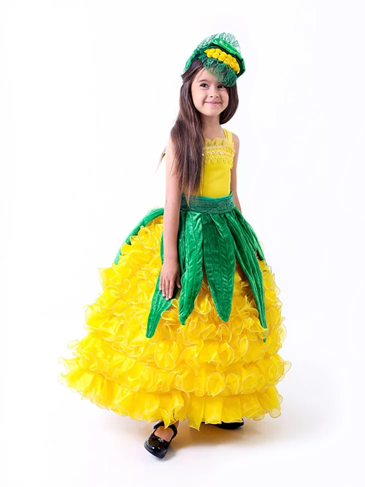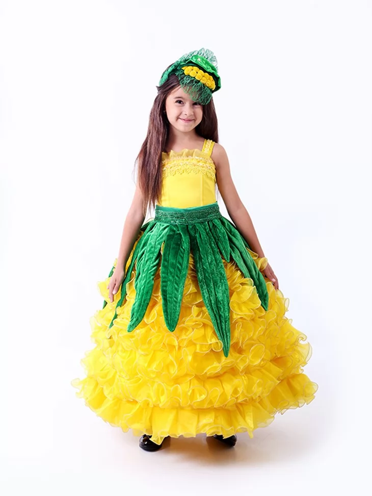 Сонячний, яскравий та по-справжньому святковий образ, який одразу привертає увагу й створює настрій щедрого врожаю. Пишна жовта спідниця з хвилястими шарами нагадує стиглі кукурудзяні зерна, а зелені декоративні елементи додають образу природності та казковості. Такий варіант чудово підходить для оренди карнавальних костюмів на осінні свята, шкільні виступи та тематичні ранки.