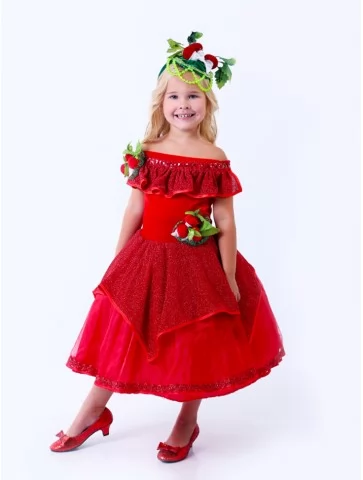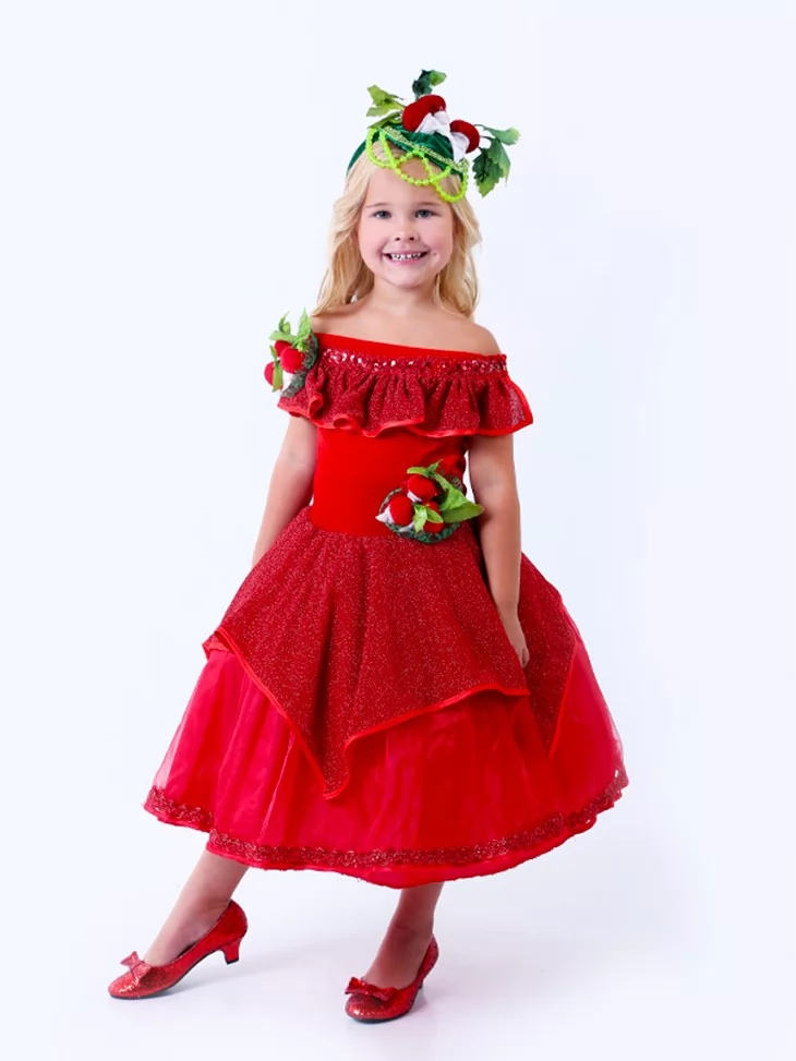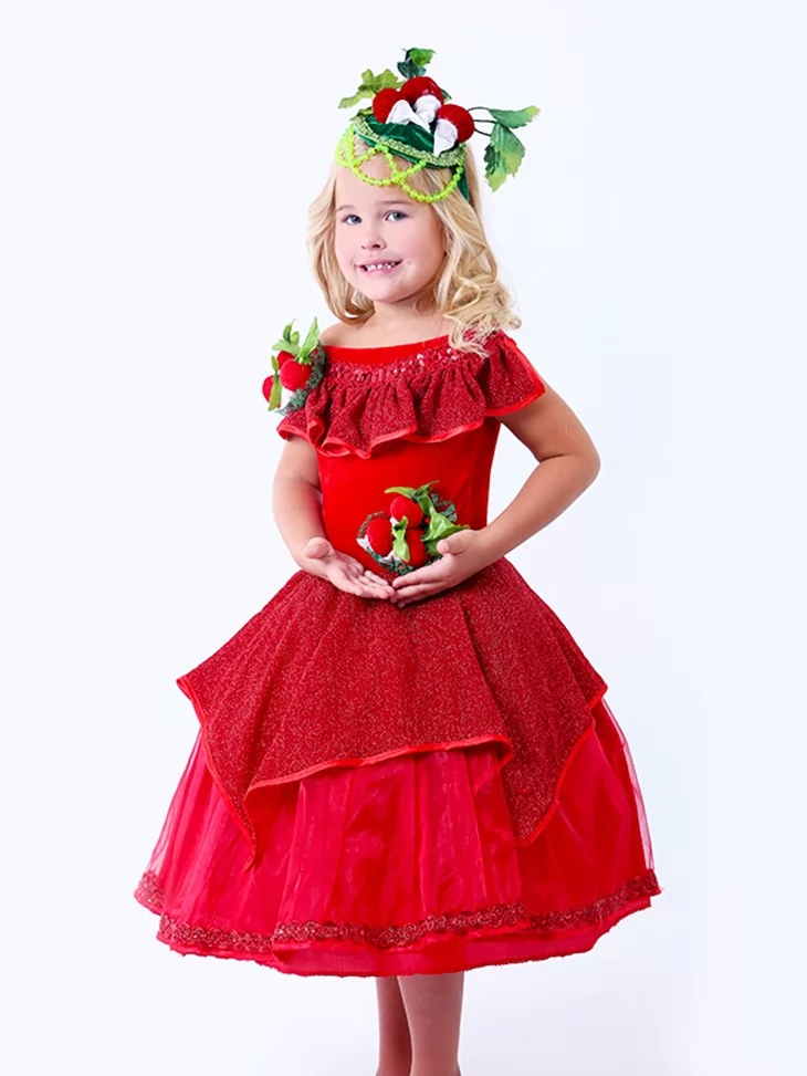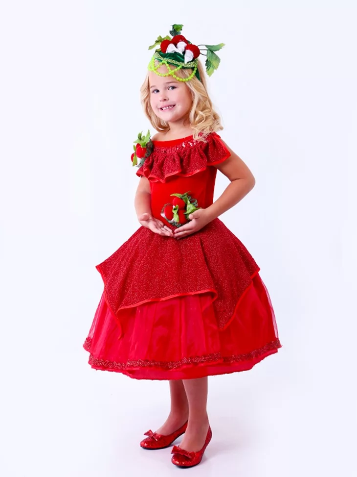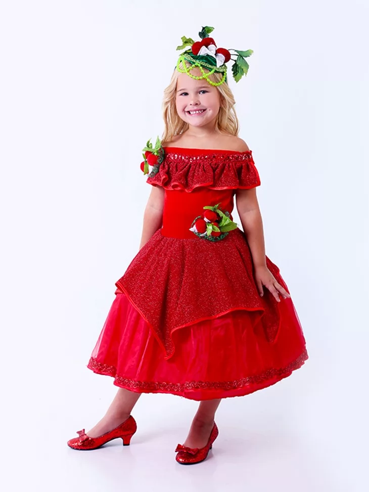 Яскравий овочевий образ, сповнений кольору, радості та святкового настрою. Насичена червона сукня з пишною спідницею створює ефектний силует, а декоративні елементи у вигляді редиски додають образу казковості та оригінальності. Такий варіант чудово підходить для оренди карнавальних костюмів на осінні свята, вистави та тематичні заходи.