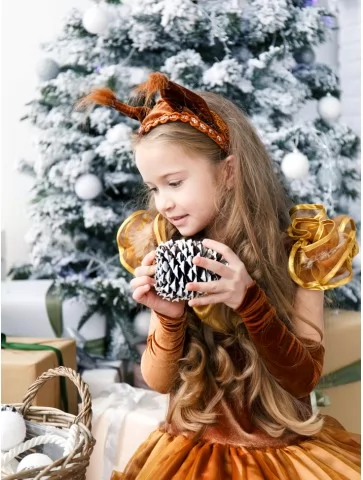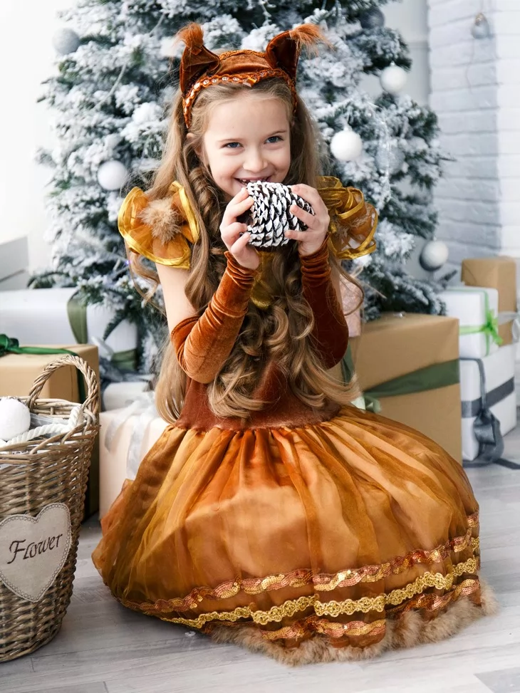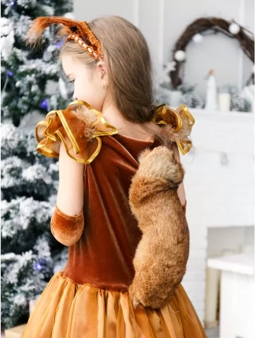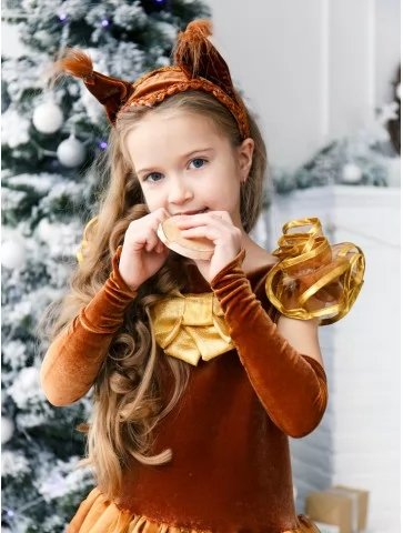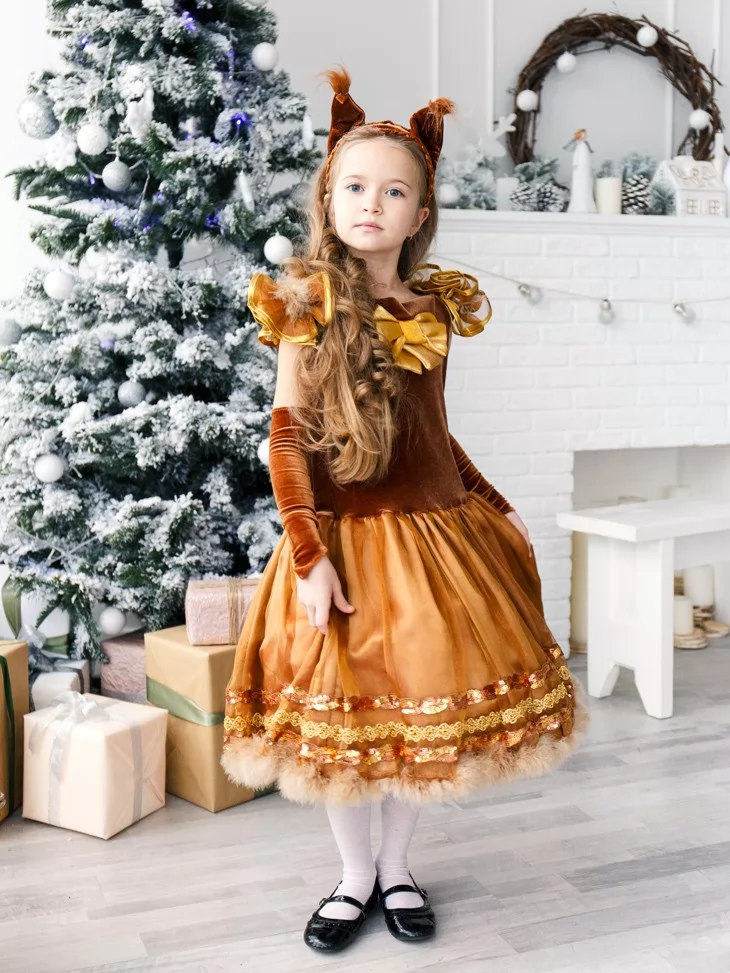 Чарівний і дуже затишний образ лісової білочки, створений у теплих медово-карамельних відтінках.Оксамитовий верх, пишна спідниця з декоративними стрічками та пухнастою обробкою надають костюму святкового вигляду й казкового настрою. Це ідеальний варіант для оренди карнавальних костюмів, коли потрібен ніжний, впізнаваний дитячий образ для зимових свят.