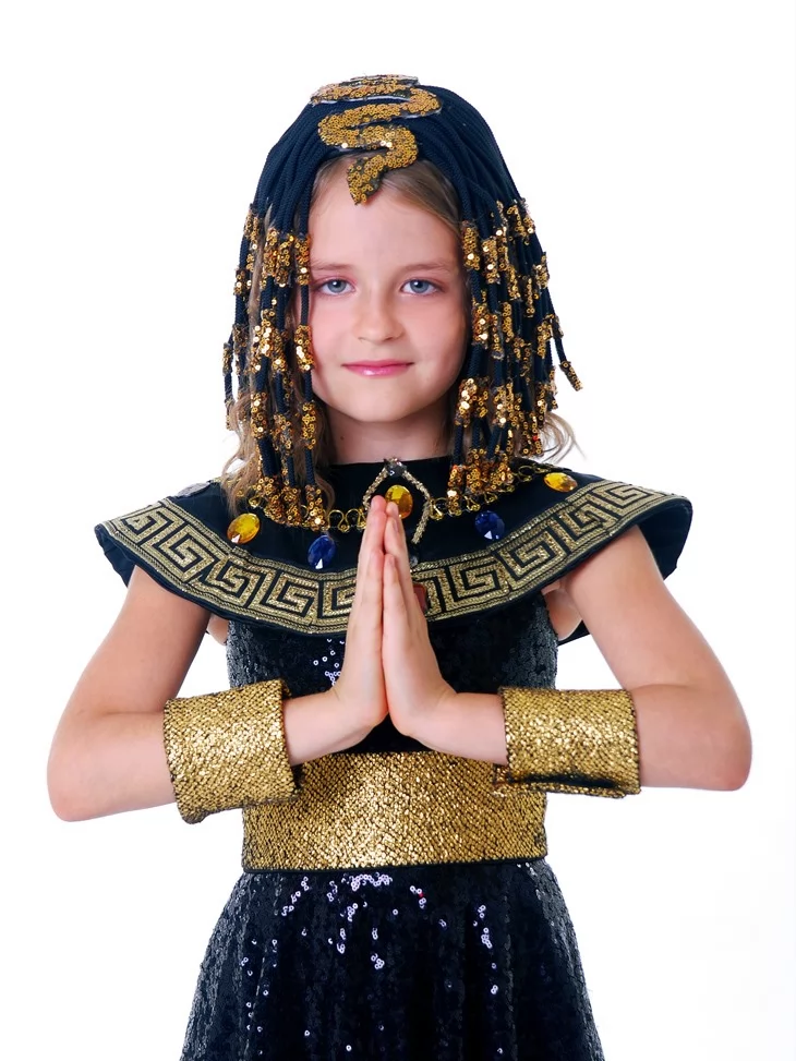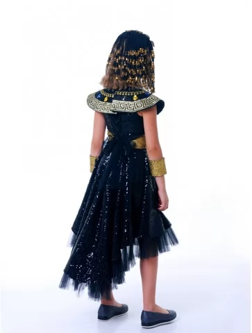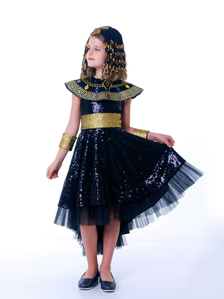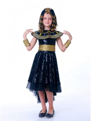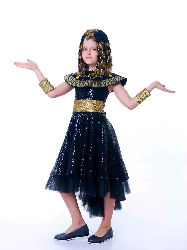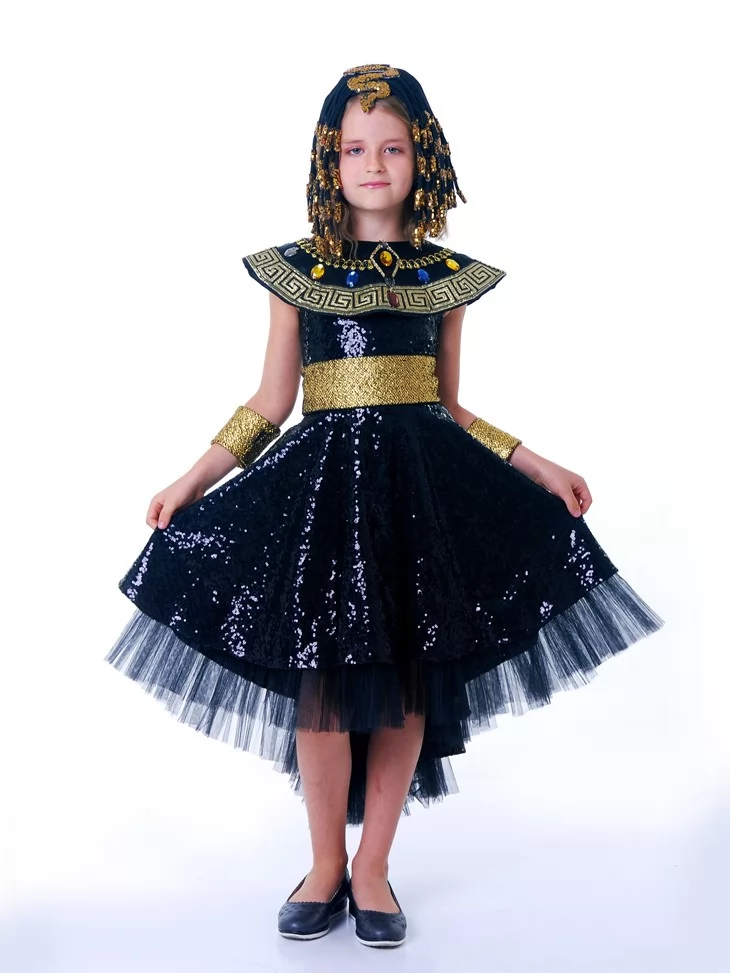 Таємничий та величний образ, що переносить у світ пірамід, золота й стародавньої магії. Глибокий чорний колір у поєднанні з золотими акцентами створює ефект справжньої цариці Давнього Єгипту. Блискуча сукня з паєтками, декоративний комір із геометричним орнаментом та характерна єгипетська перука роблять образ впізнаваним і дуже сценічним. Це вдалий вибір для оренда карнавальних костюмів, коли потрібен сильний, статусний персонаж.