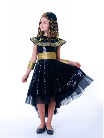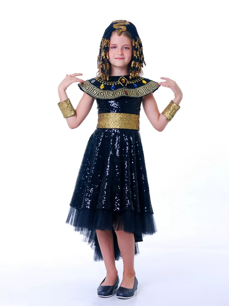 Костюм Єгипетської Цариці Чорного Нілу створює відчуття сили, загадковості та справжньої царської величі з першого погляду. Основний силует виглядає урочисто та водночас легко — пишна спідниця з фатиновим низом красиво рухається, а золота обробка підкреслює царське походження образу. Костюм часто обирають і для прокат карнавальних костюмів у категоріях «Єгипет», «Стародавні цивілізації», «Цариці».