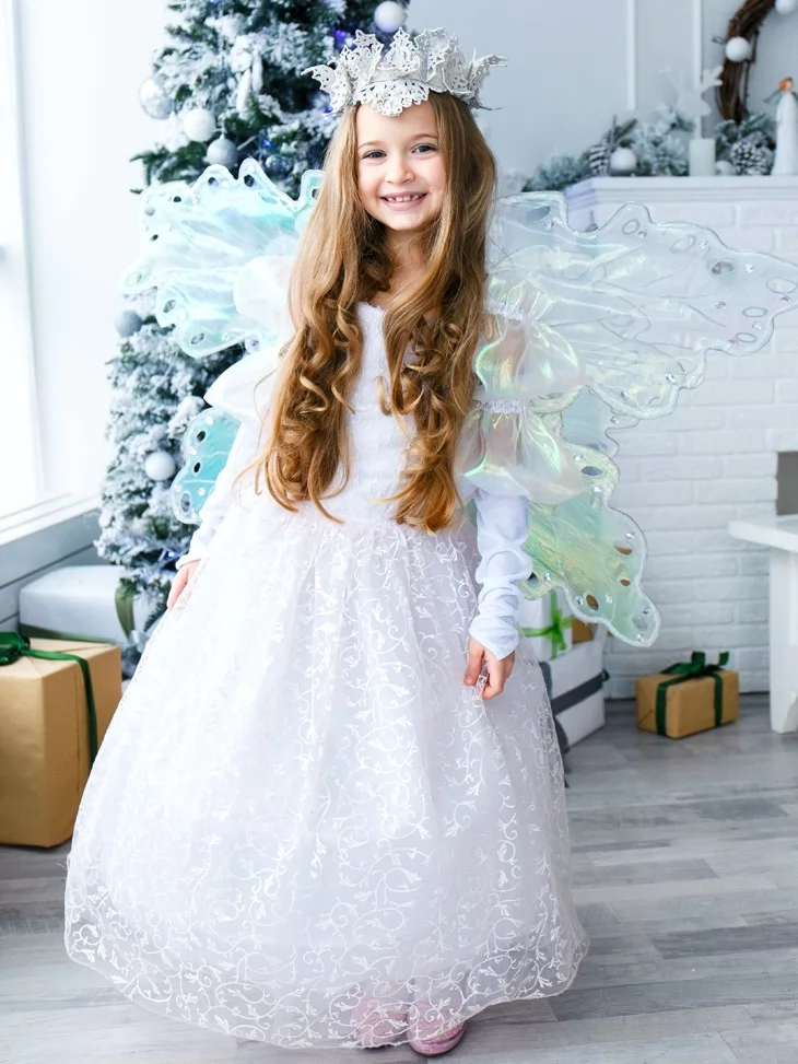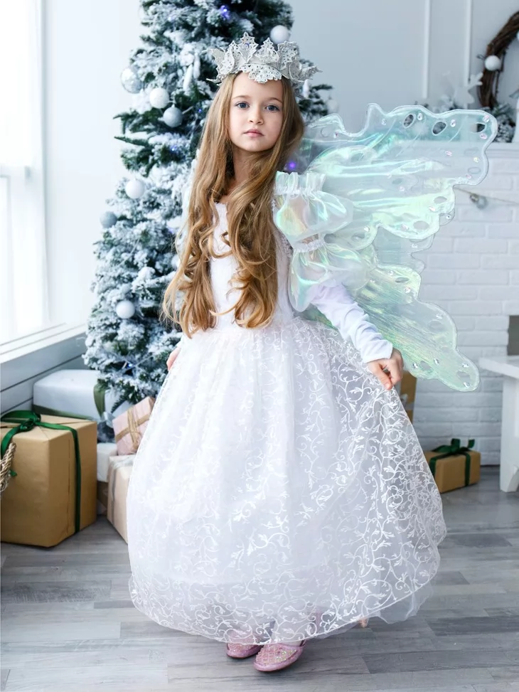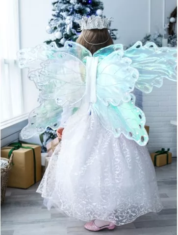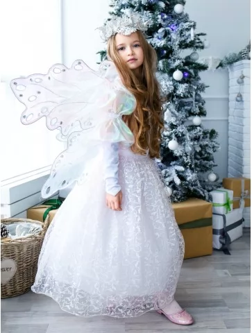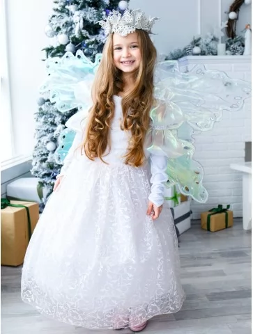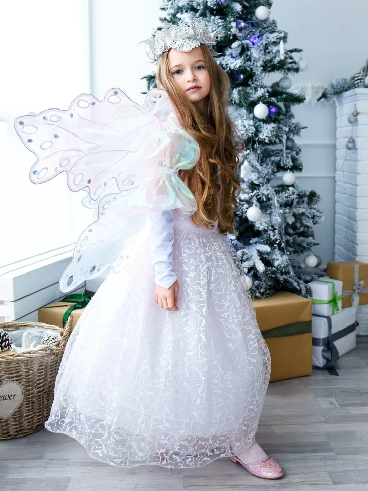 Ніжний та чарівний образ, у якому зимова королева поєднується з казковою феєю світла. Повітряна біла сукня з витонченим візерунком огортає силует м’якою легкістю, а напівпрозорі перламутрові крила переливаються холодними відблисками, ніби створені з морозного сяйва. Це ідеальний варіант для оренди карнавальних костюмів на новорічні свята, фотосесії та святкові виступи. Образ виглядає урочисто, казково та дуже ніжно — справжня принцеса зимового чарівного королівства.