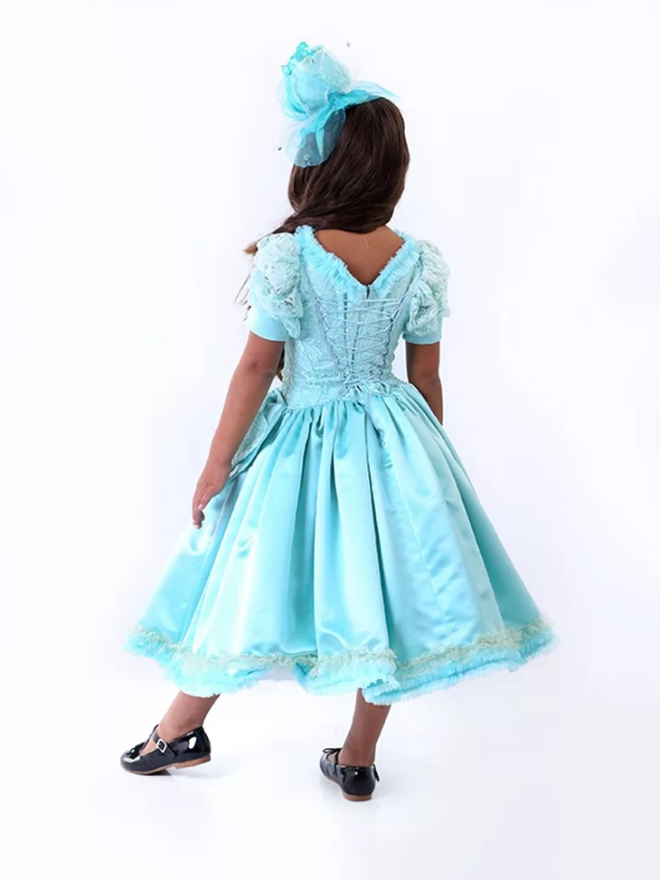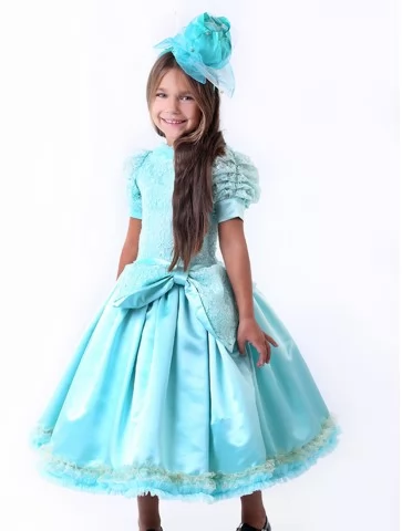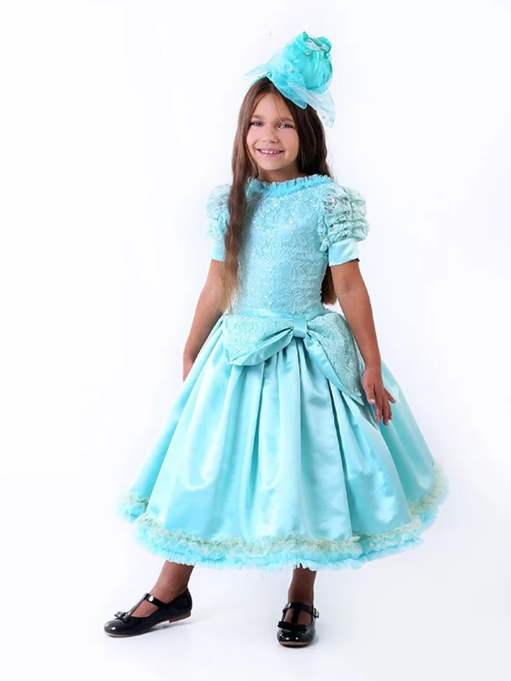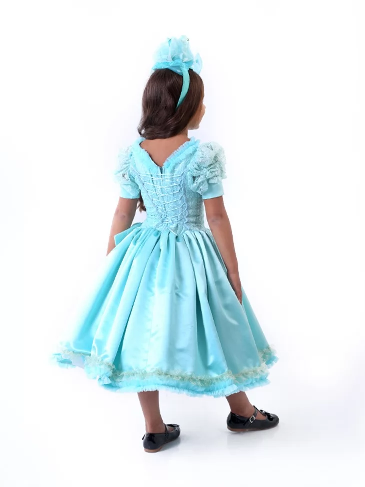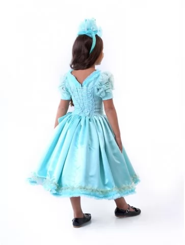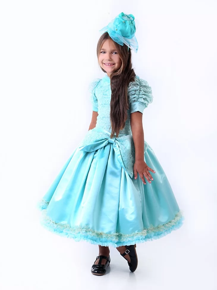 Ніжний, витончений образ у прохолодному блакитному відтінку, що нагадує свіжість осіннього ранку. Об’ємна спідниця з м’яким блиском і декоративний головний убір створюють казковий силует, який виглядає святково та акуратно. Такий варіант ідеально підходить для оренди карнавальних костюмів на свято Осені, виступи та тематичні фотосесії.